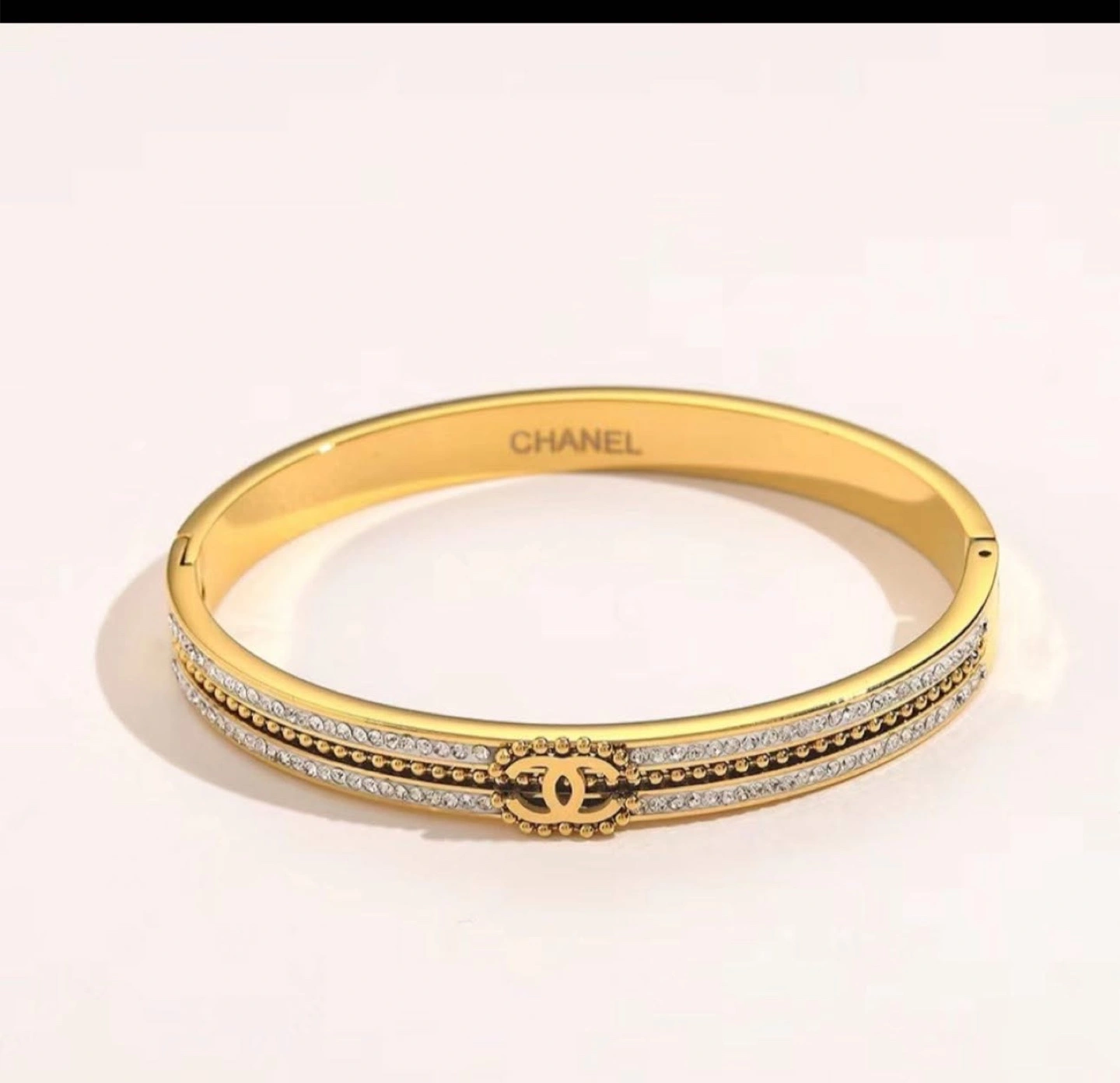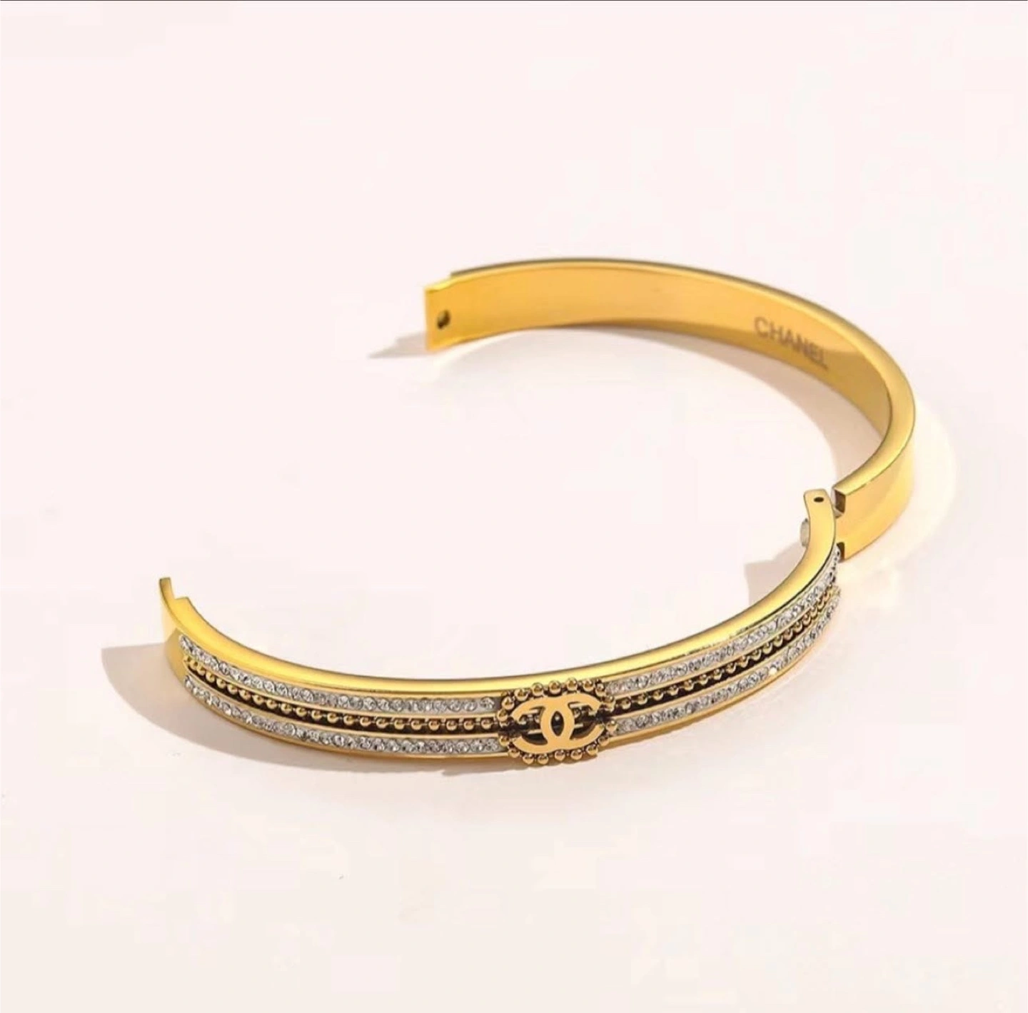 Selling a beautiful gold Chanel bangle bracelet. It features the iconic Chanel logo and is adorned with sparkling crystals. A stylish accessory to elevate any outfit!