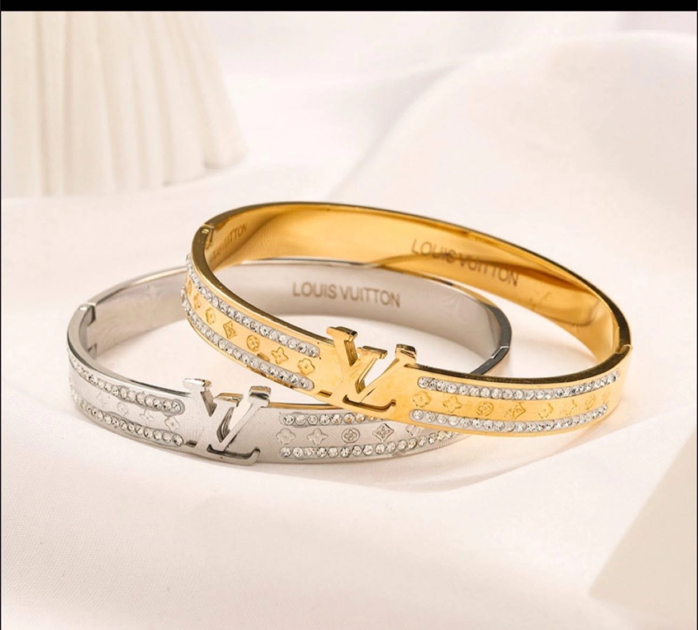 Selling a set of Louis Vuitton bangle bracelets! One is gold and the other is silver, both adorned with sparkling details. They're in great condition and ready to add a touch of luxury to your wrist