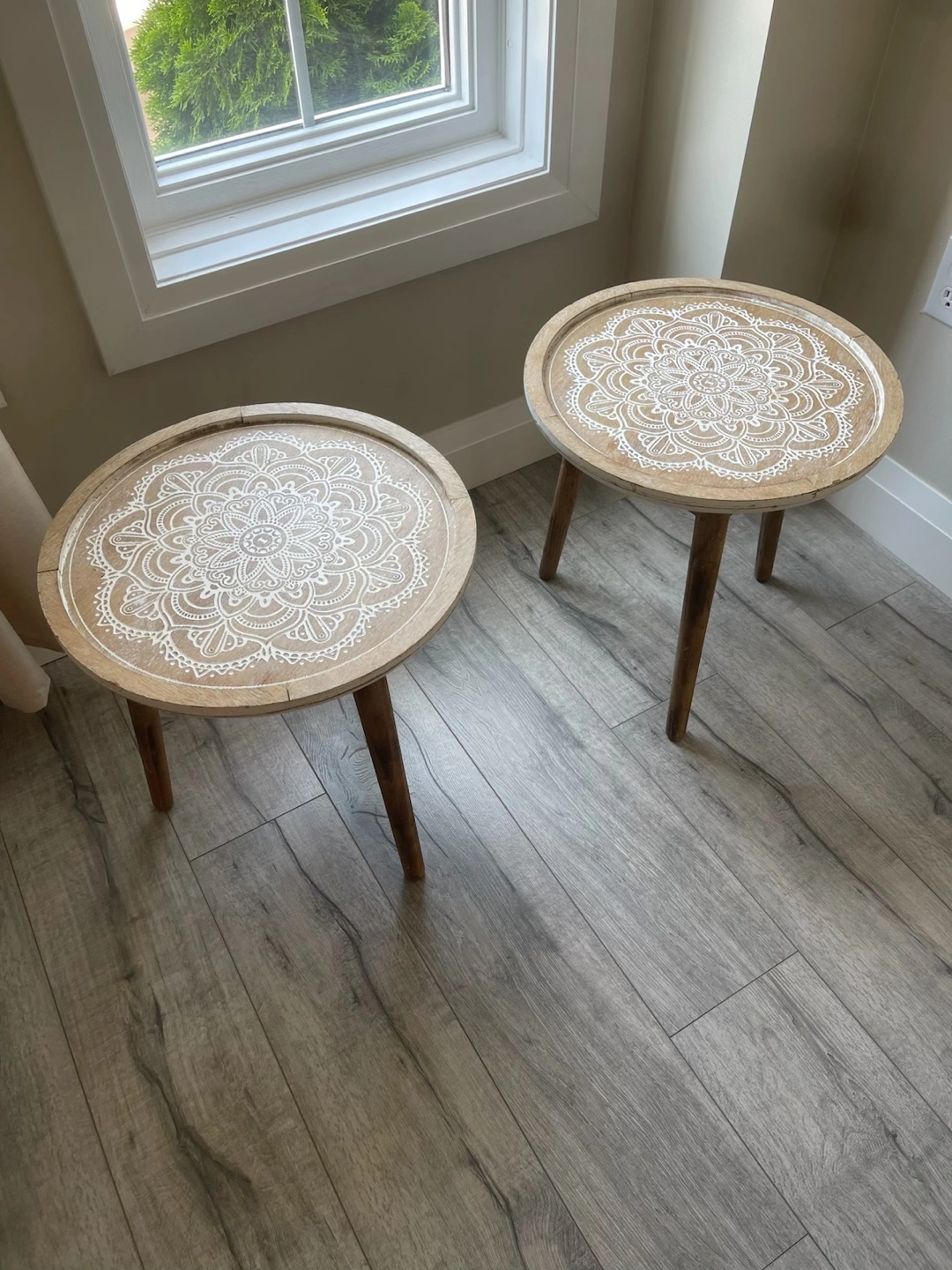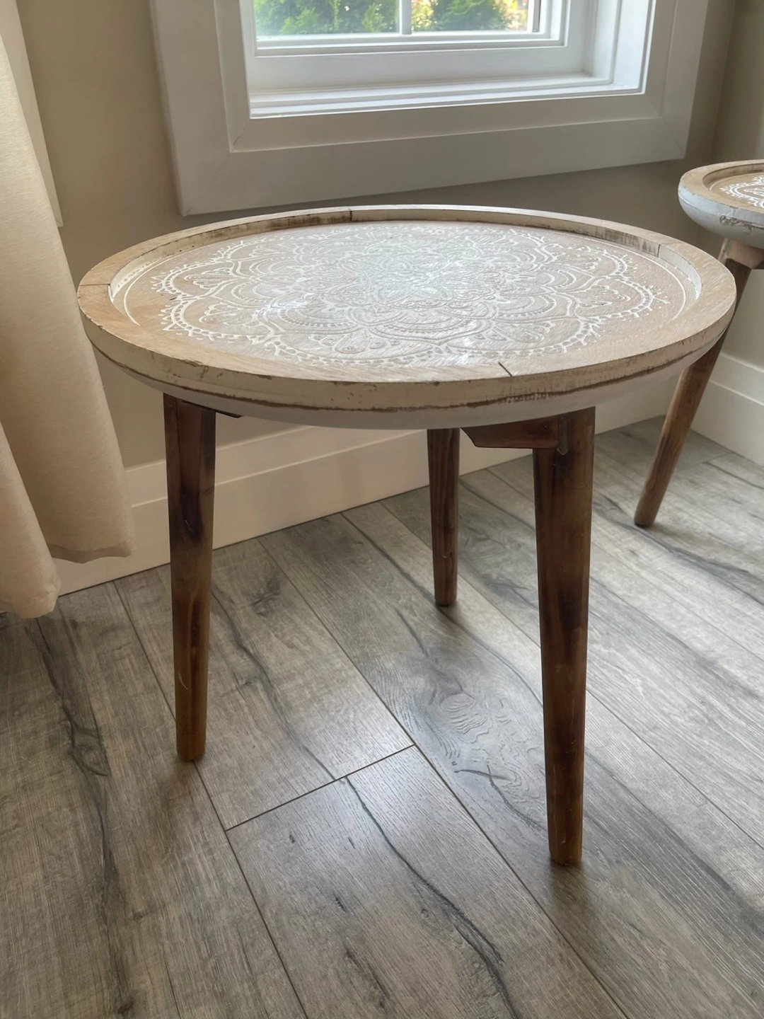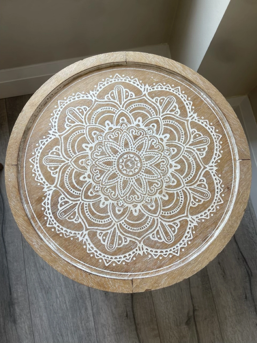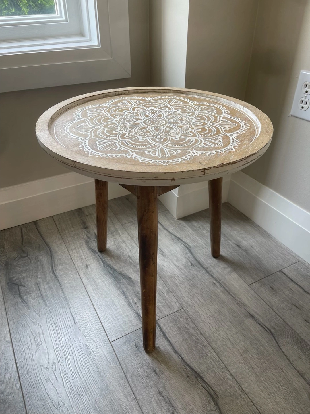 Selling a cute round side table! It has a beautiful white mandala design on top and wooden legs. It's perfect for adding a touch of boho style to any room in your home