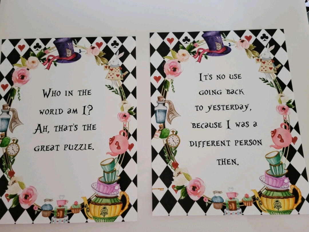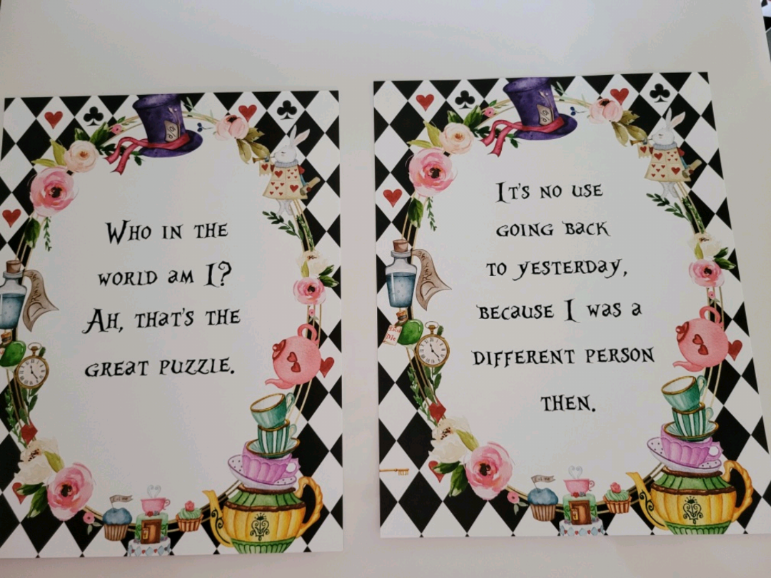 Selling an Alice in Wonderland-themed homemade prints. It's got teapots and cups, the Rabbit's watch, the Mad Hatter's hat, and other iconic imagery from the story. Great for any Disney or Alice in Wonderland fan.