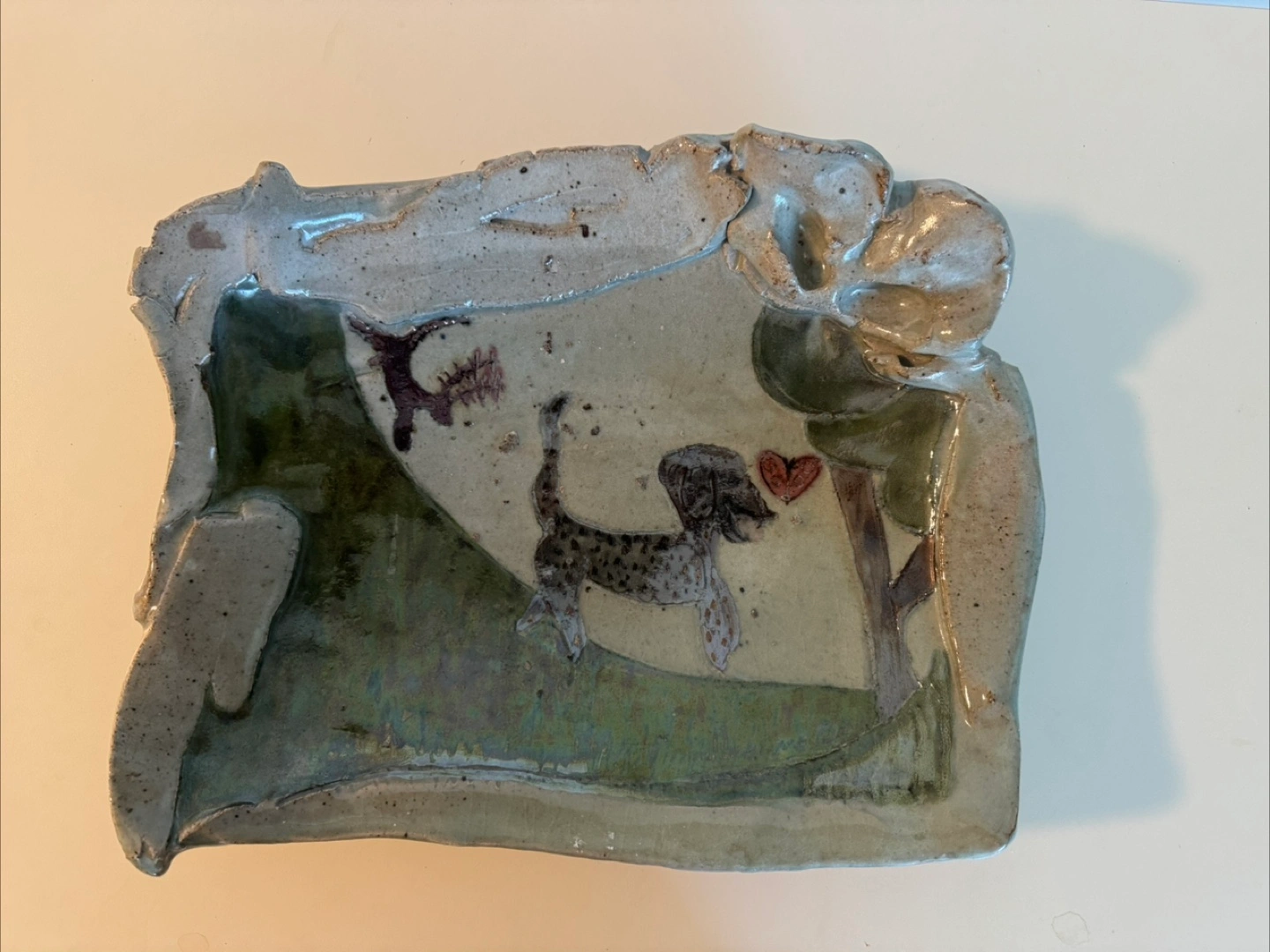 Selling a unique handmade ceramic tray! It features a cute dog design in a nature scene. Perfect for adding a touch of whimsy to your home decor or as a quirky serving dish