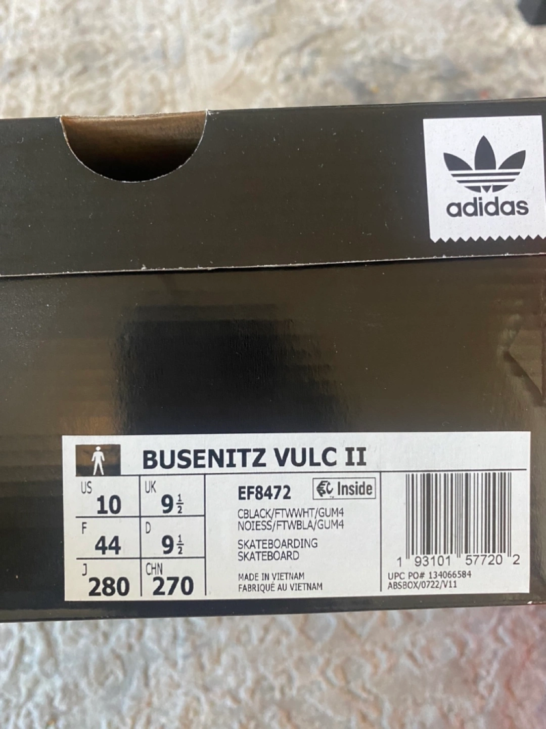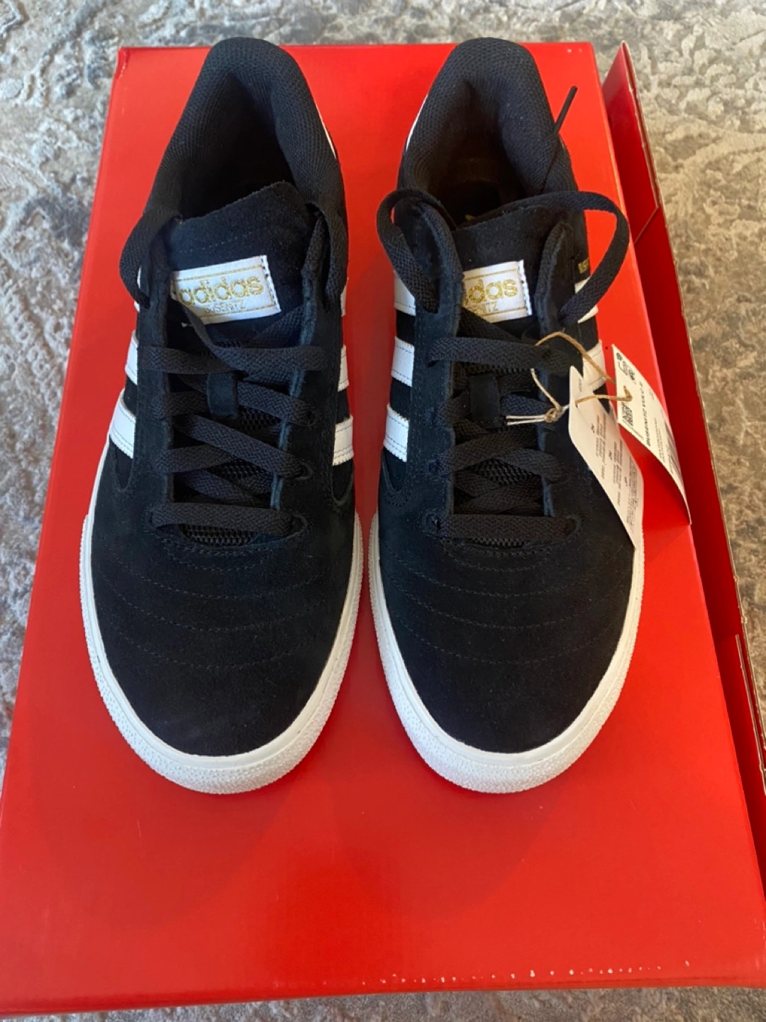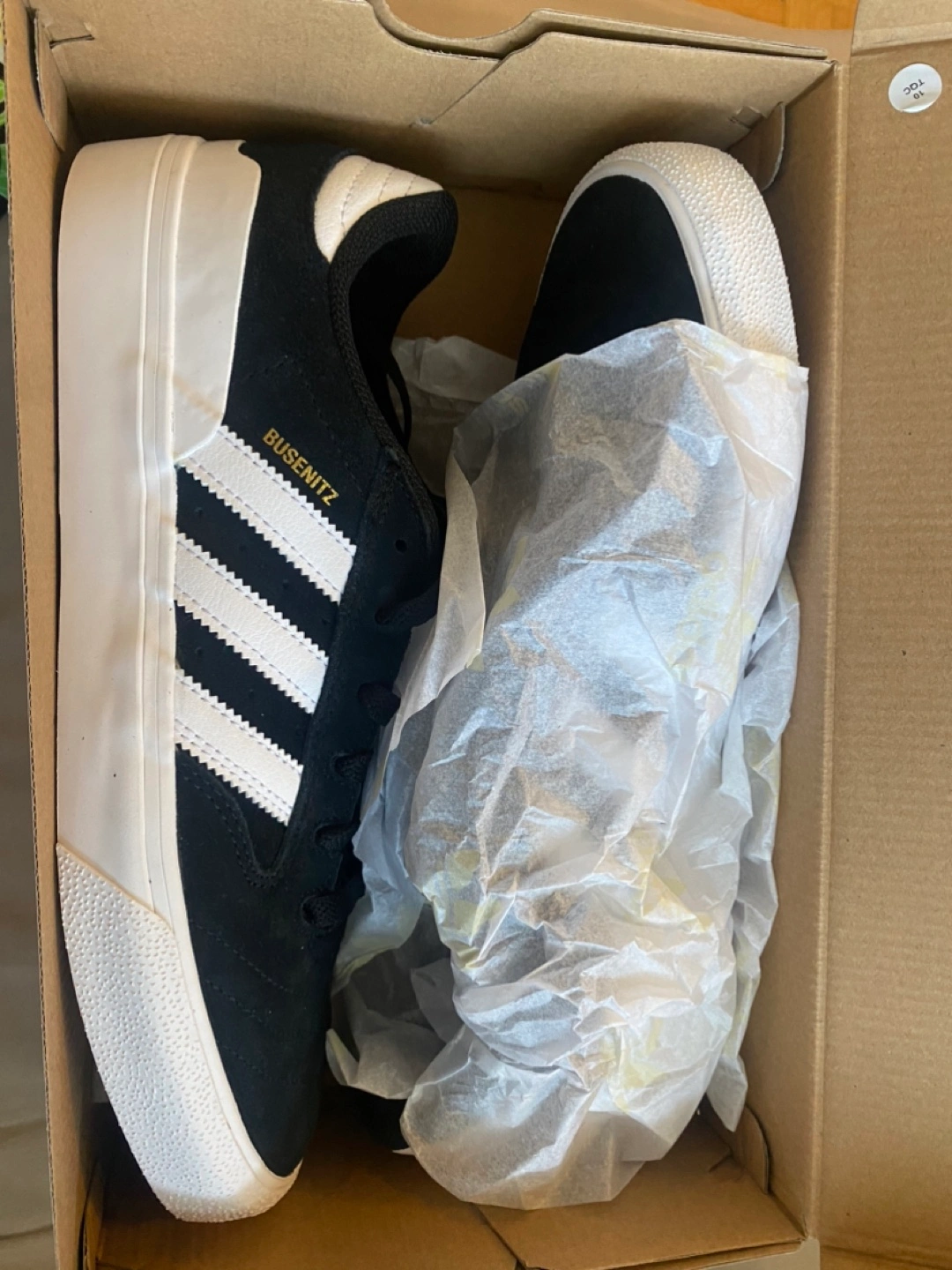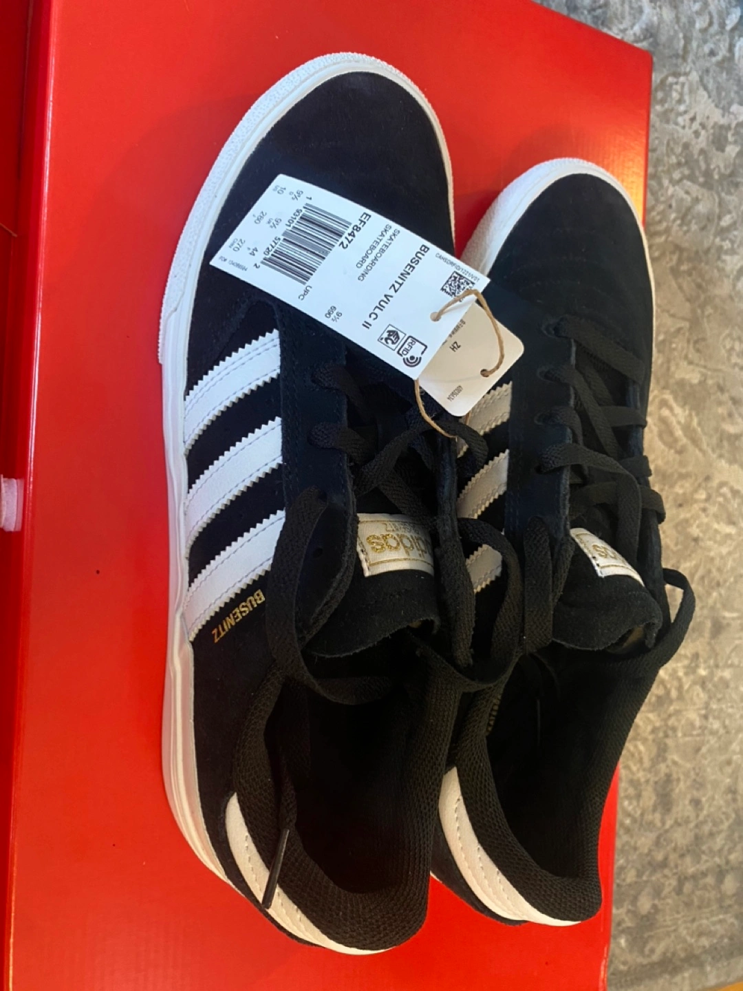 Selling a pair of brand new Adidas Busenitz Vulc II skateboarding shoes in size 10 US! These are black with white stripes and have a stylish, low-profile design. The box is included!
