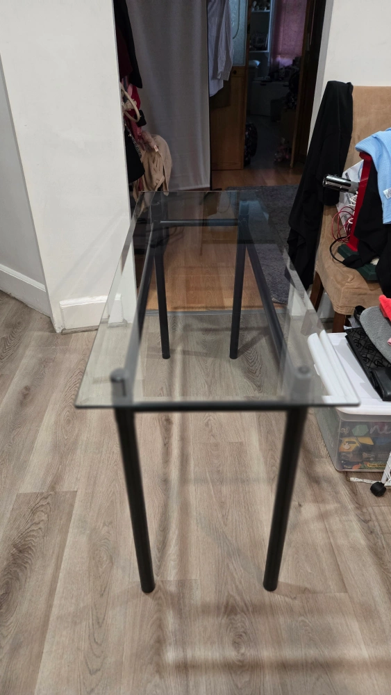 Selling a glass top table with black legs. It's in great condition and would be perfect as a side table or small desk. The glass is clear and the legs are sturdy. Glass has some scratches on it.