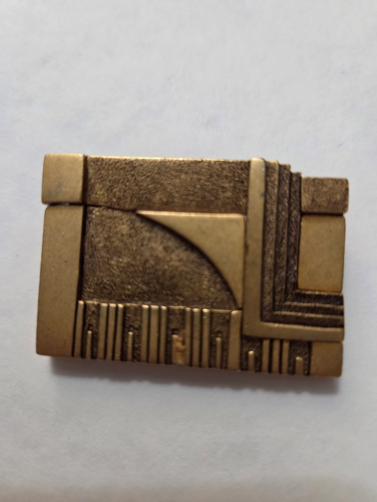 This is a vintage brooch with a unique geometric design. Inspired by Frank Lloyd Wright, purchased at a museum gift shop MANY years ago. It has an interesting texture and a golden color.