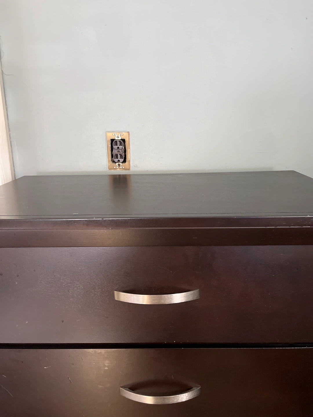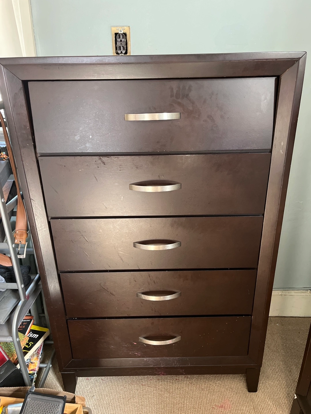 Selling a dark brown wooden dresser with five drawers. It shows some signs of use, with some scratches visible. Perfect for extra storage! Full bedroom set available. All 4 prices $400. Moving need to sell. Please make a reasonable offer