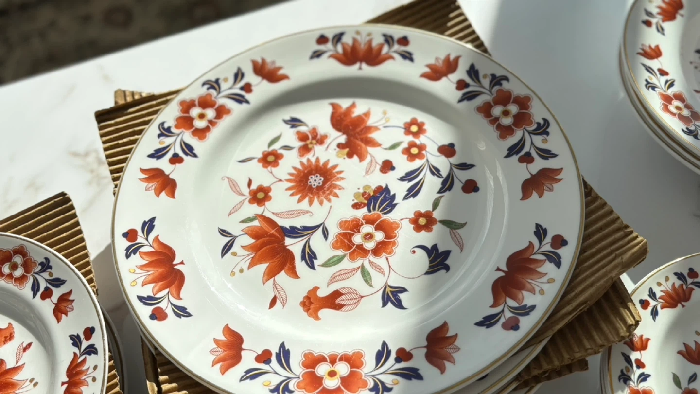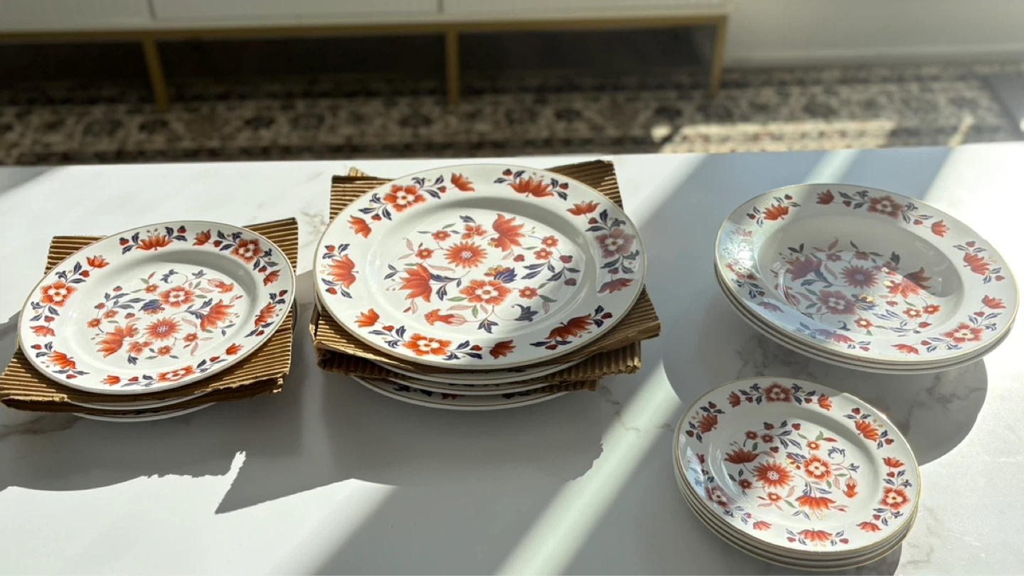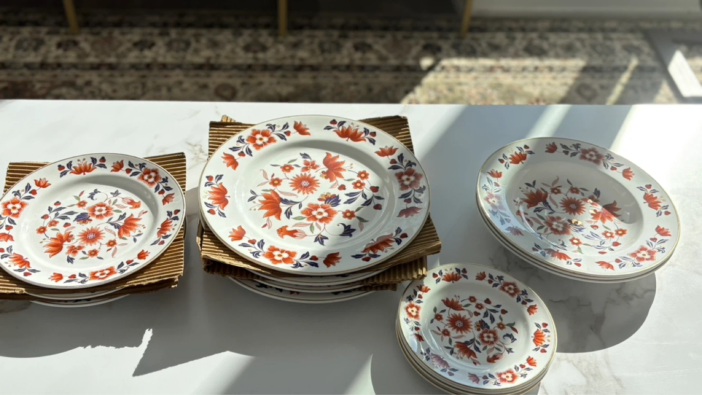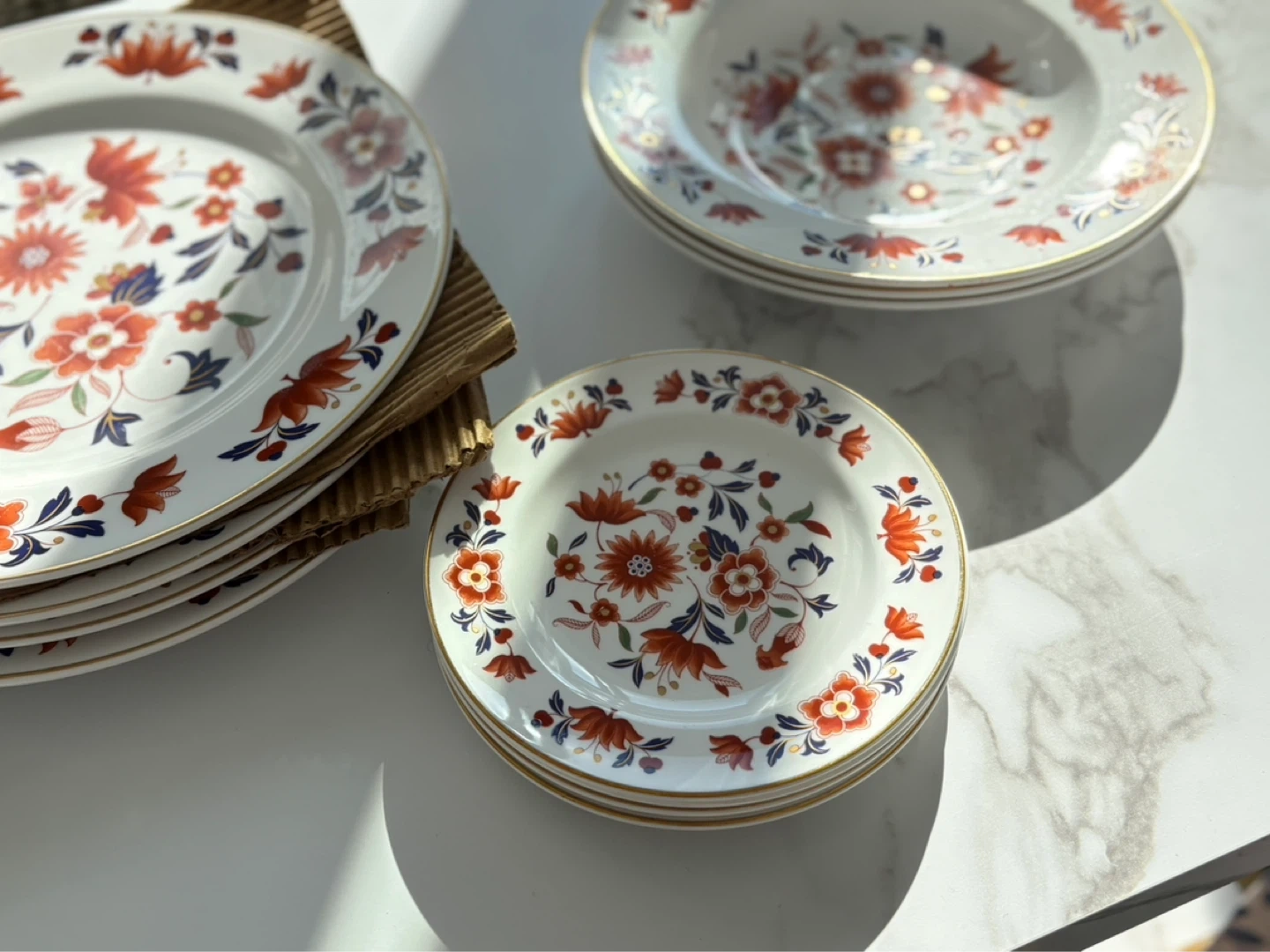 A collection of white plates with a vibrant orange and blue floral design. Gold trim along the edges. Includes dinner plates and smaller side plates.