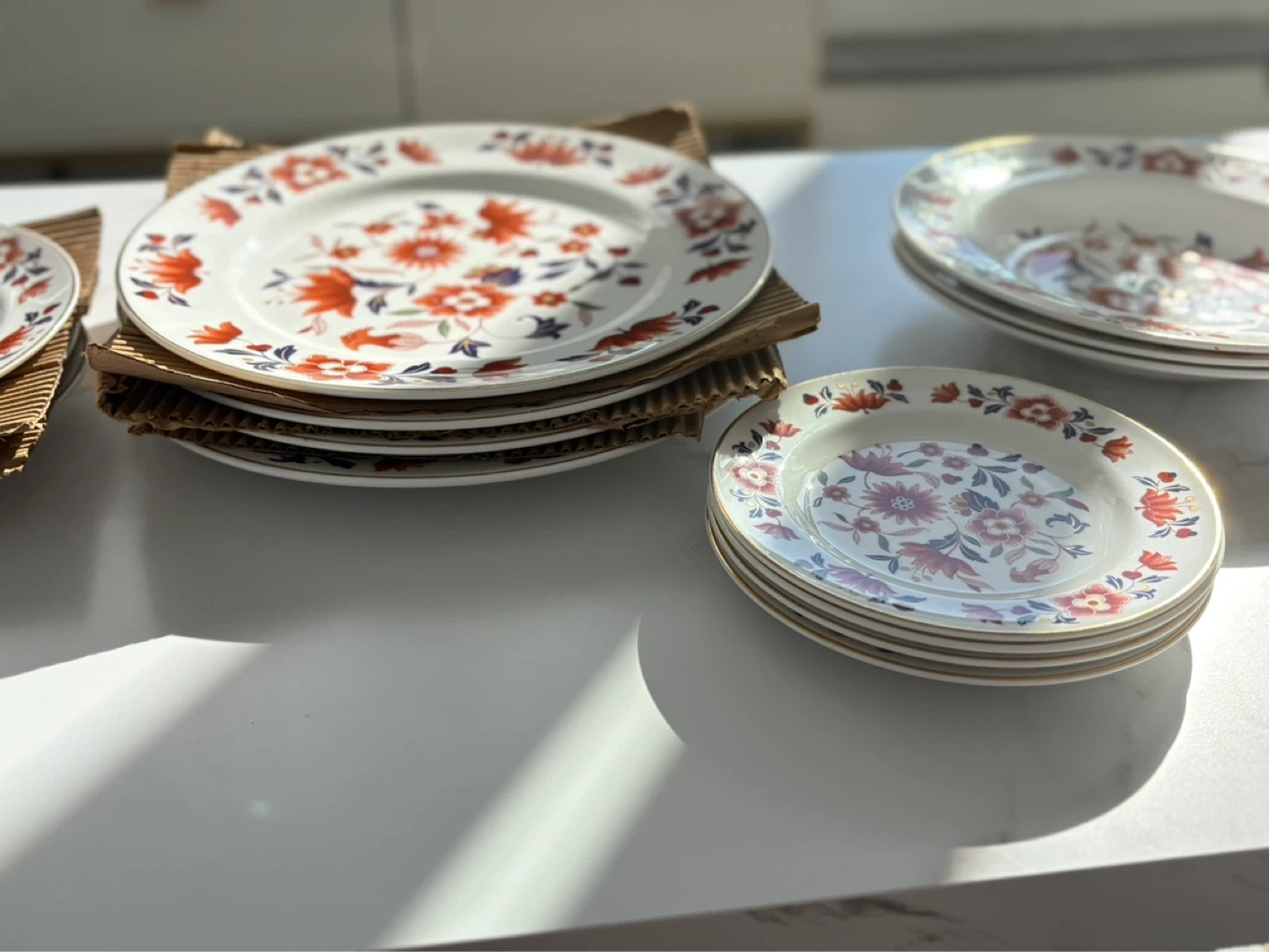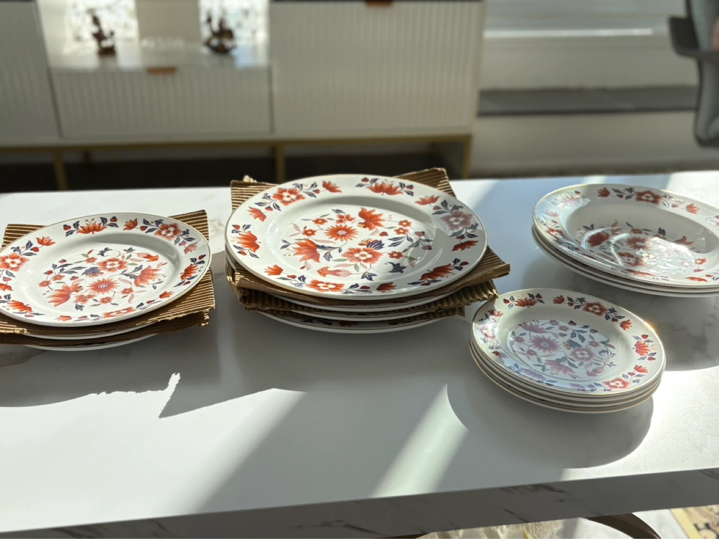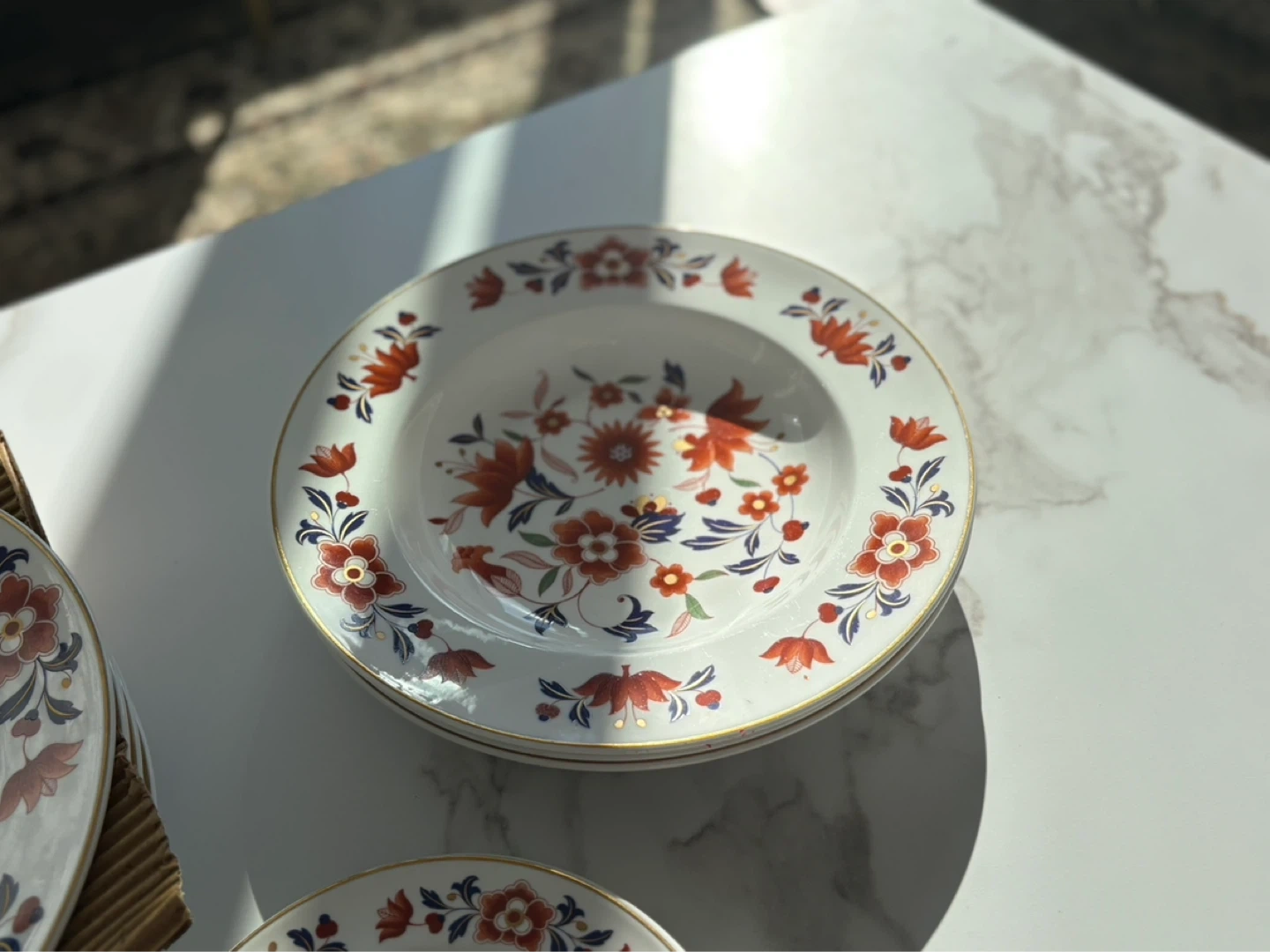 A collection of white plates with a vibrant orange and blue floral design. Gold trim along the edges. Includes dinner plates and smaller side plates.