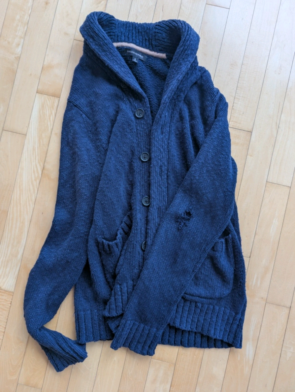 Cozy Banana Republic cardigan in a nice navy blue colour! It's a men's size small and features a button-up front and pockets. There's a hole in the elbow.