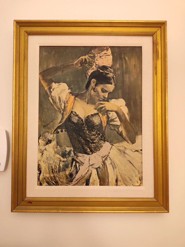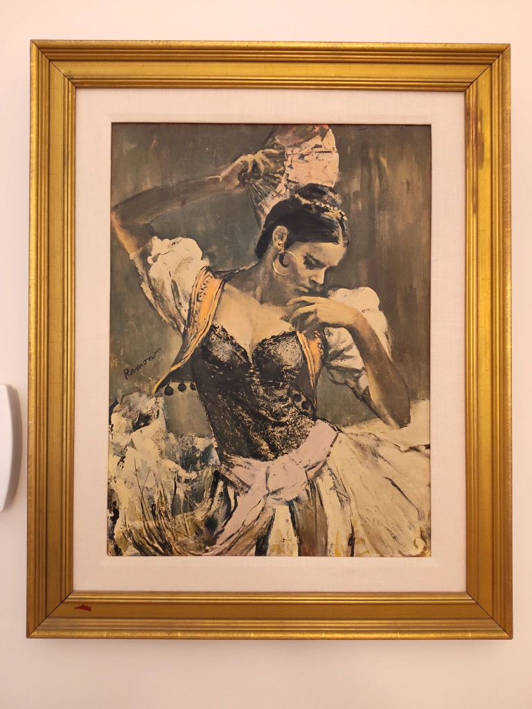 Monday Nov 3, final day! Moving and can't take it with! Selling a vintage painting signed by Ramon. The painting features a woman in a dress with a fan. It's framed and ready to hang!