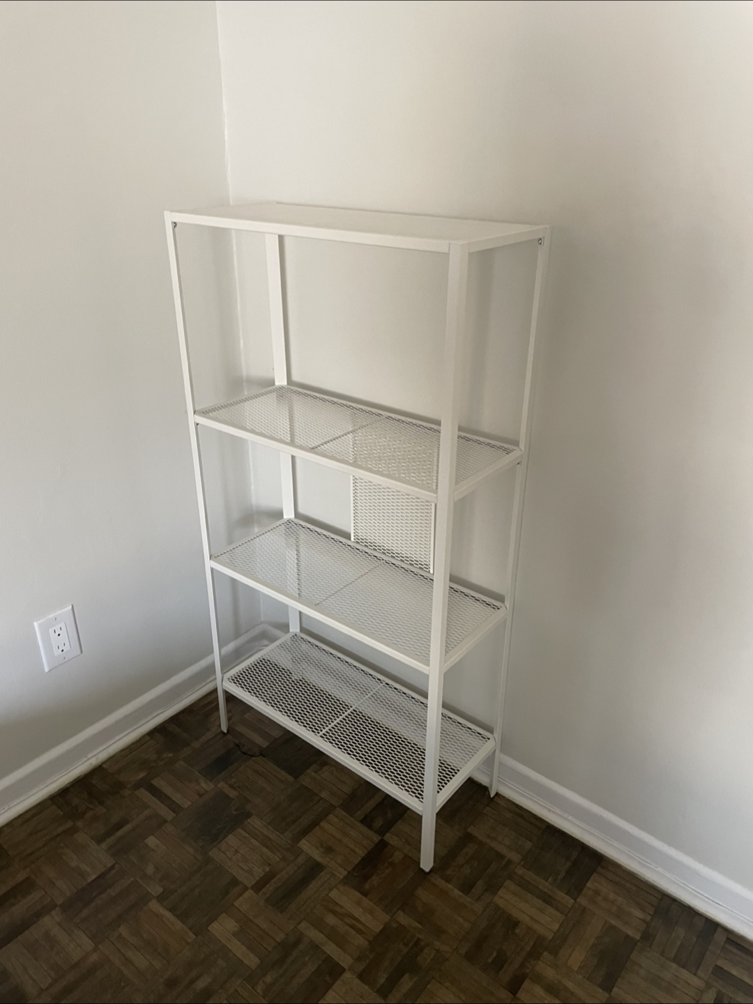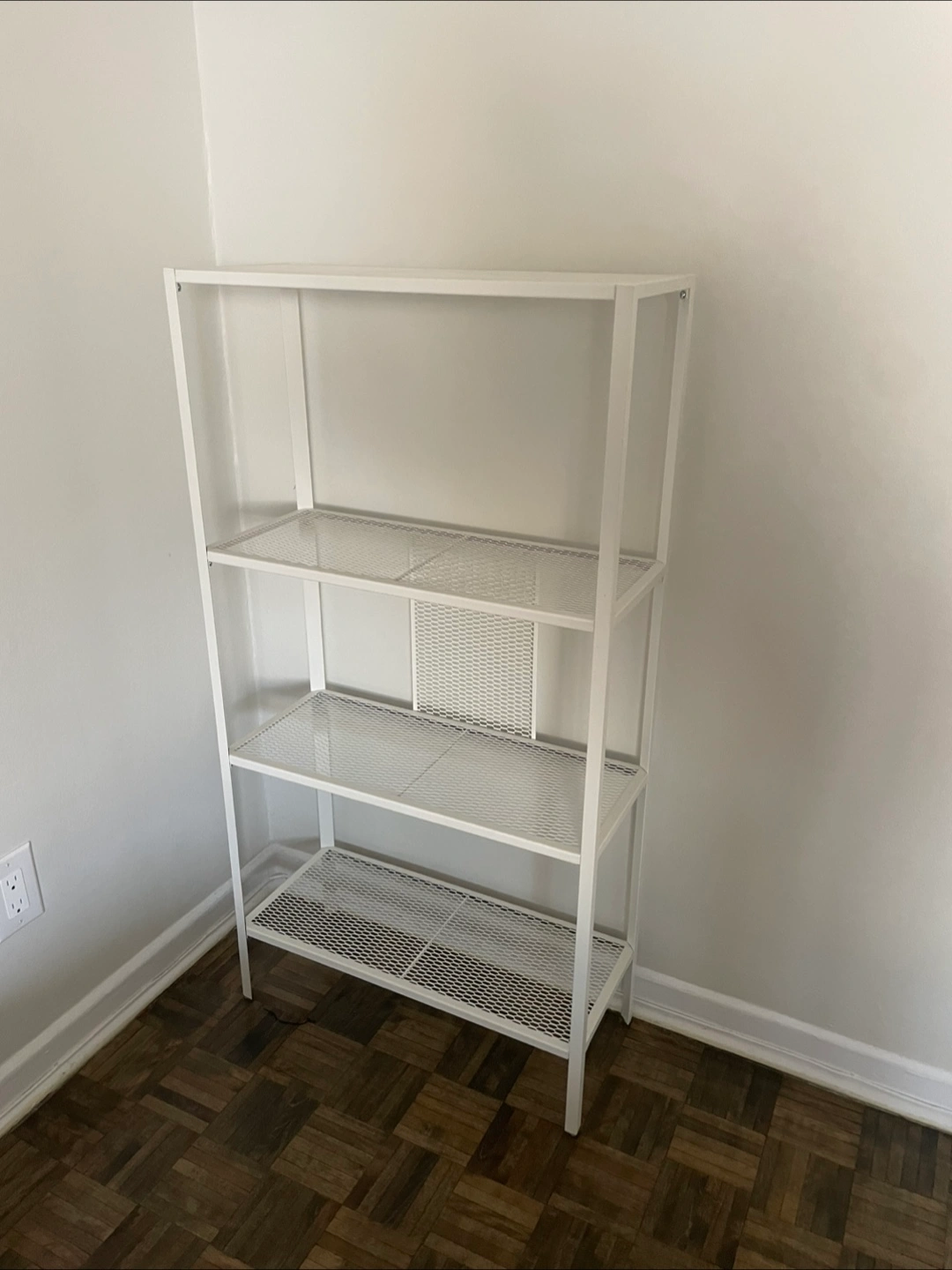 Selling a simple white metal shelf unit, perfect for storage or display! It's in good condition and ready for a new home. Great for any room!