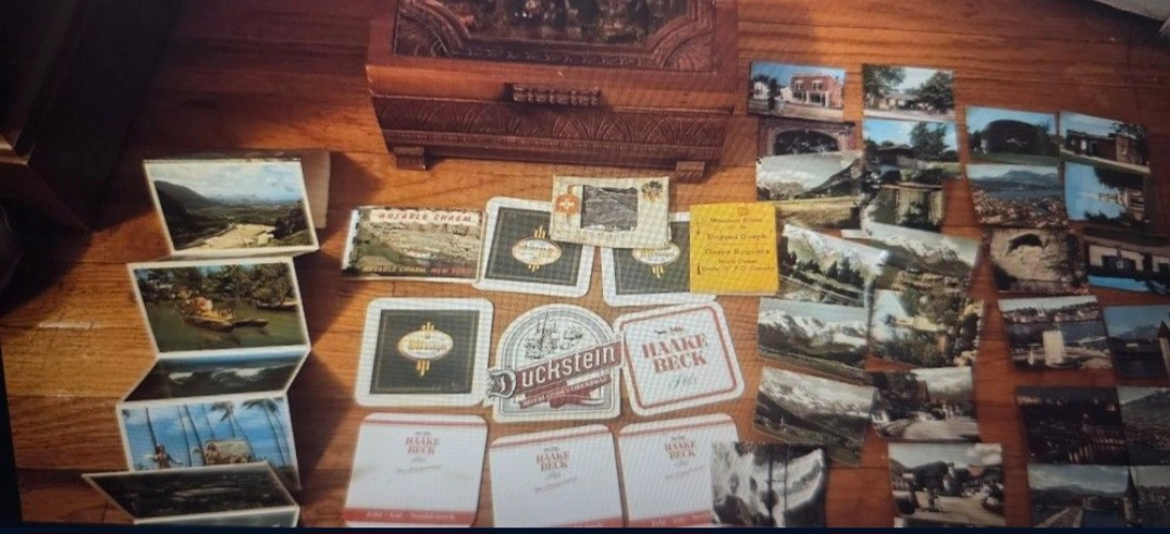 Selling a vintage wooden box that comes with a collection of postcards and coasters. The box has intricate carvings and a unique design, perfect for adding a touch of nostalgia to your home. The postcards feature various scenic views, and the coasters include beer brand logos like Haake Beck and Duckstein. Great for collectors or anyone who appreciates vintage items!
