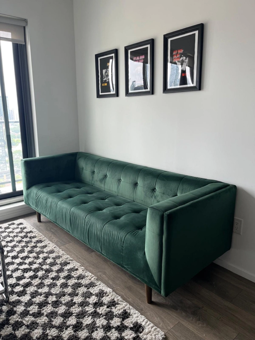 Selling a beautiful emerald green velvet sofa! It's in great condition and would look amazing in any living room.
