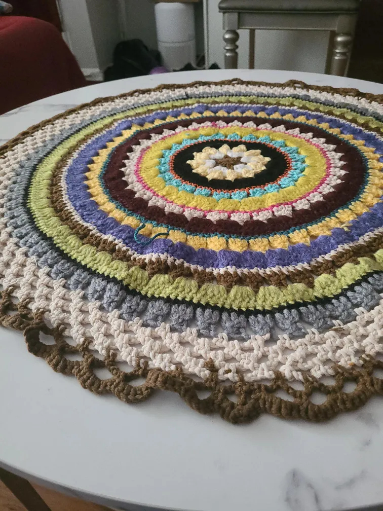 Check out this unique handmade crochet round rug! It features a variety of colors and a lovely, intricate design. Perfect for adding a cozy and artistic touch to any room