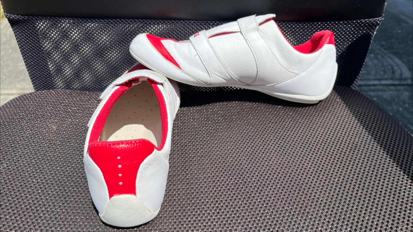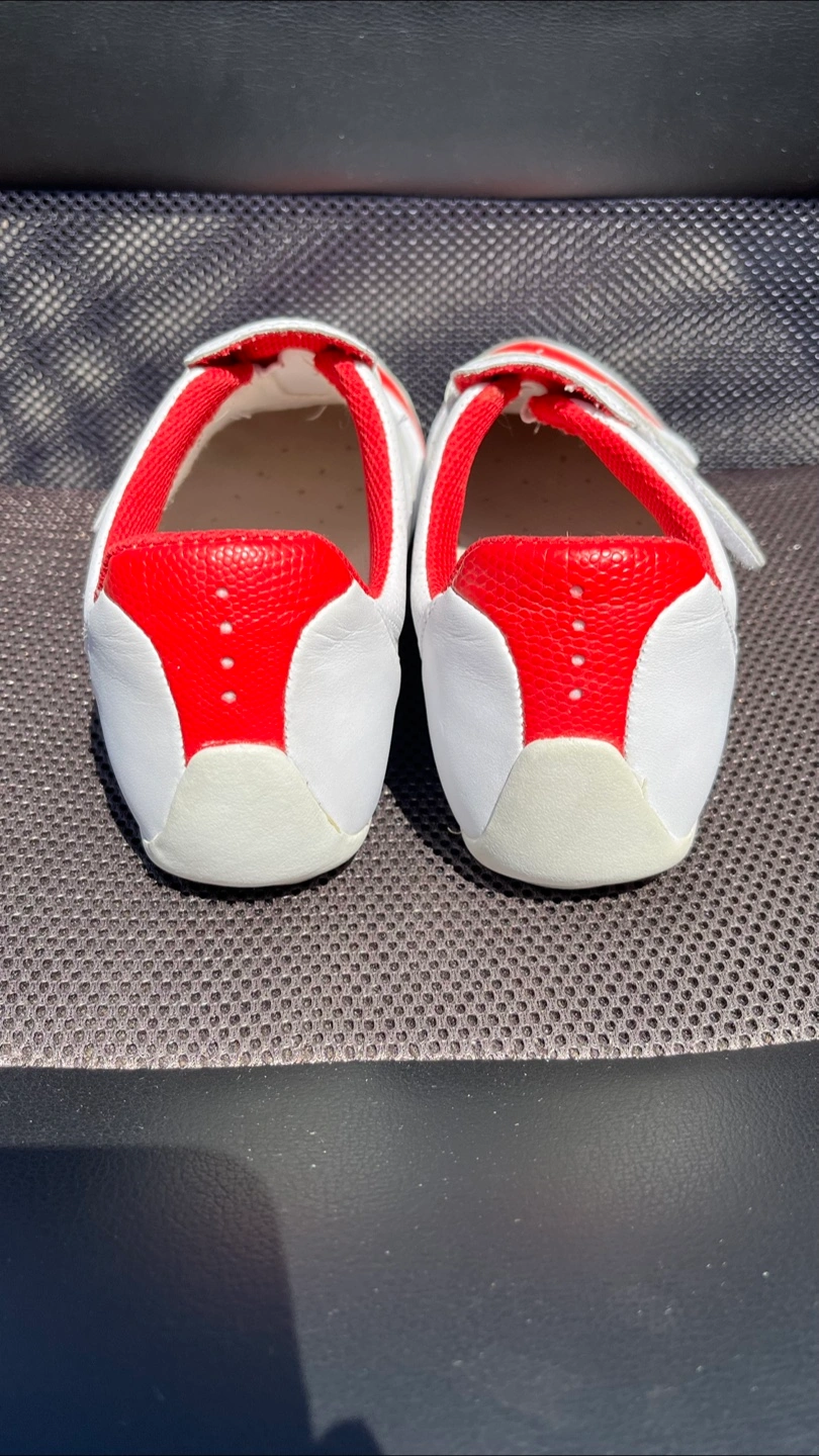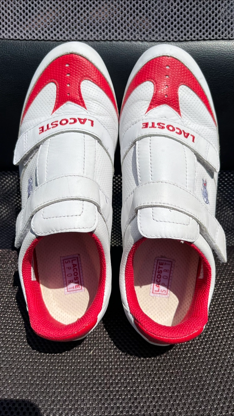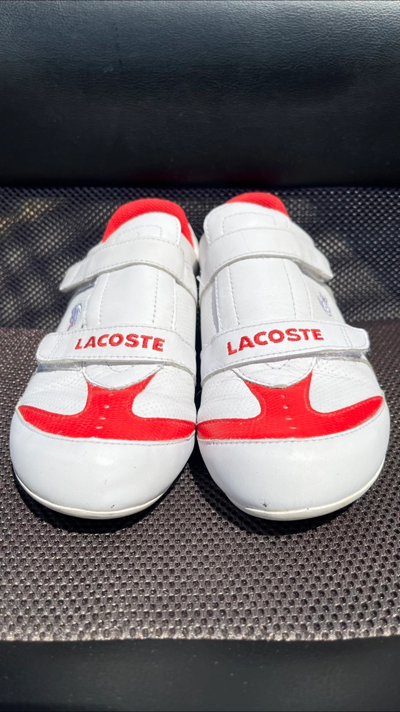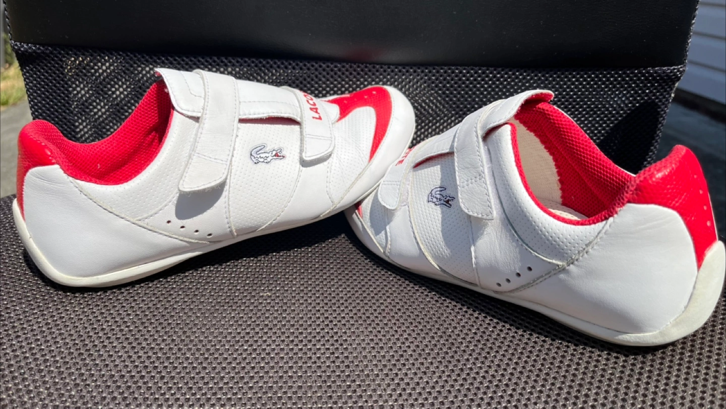 Selling a pair of Lacoste sneakers in white and red. They feature an adjustable velcro strap and the Lacoste logo. Great for casual wear. Size 7 women’s and my wife wore them every Canada Day until storing them indoors Clean inside and out and from a pet and smoke free home.