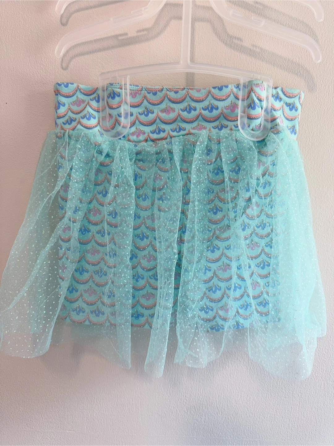 A cute little set for your little one! Includes a plain white cotton tank top and a turquoise skirt with a fun pattern and tulle overlay. Size 6-7T