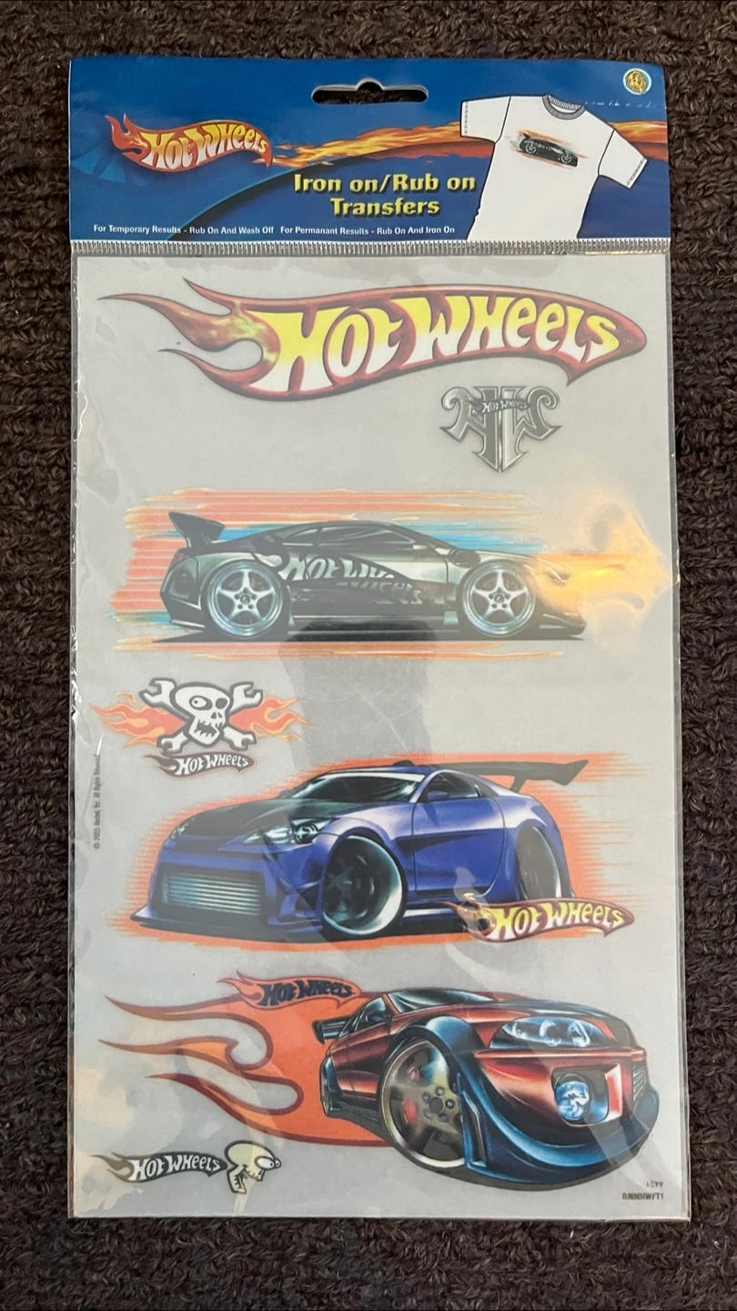 Four iron on transfers. Brand new, sealed, never opened, no rips or bends because Hot Wheel collectors are like that :) A rare item indeed. Made in Canada.