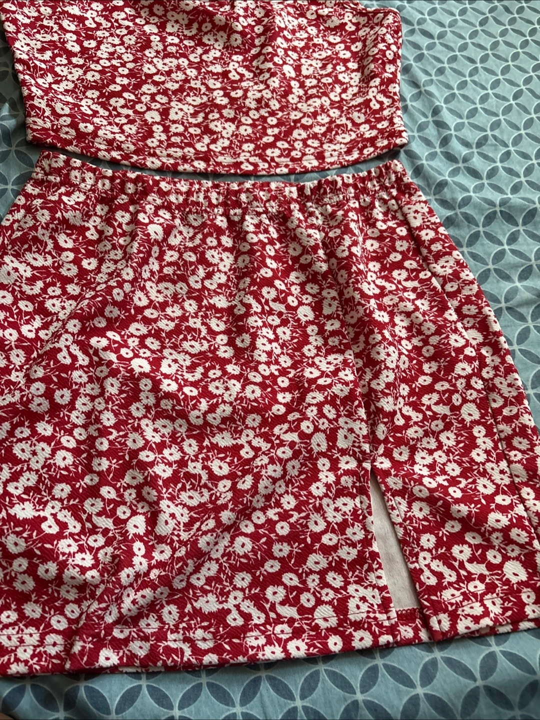 Selling a cute floral two-piece set from Shein! It's a size medium and features a red and white floral pattern. The set includes a top and a skirt with a slit. Perfect for summer!