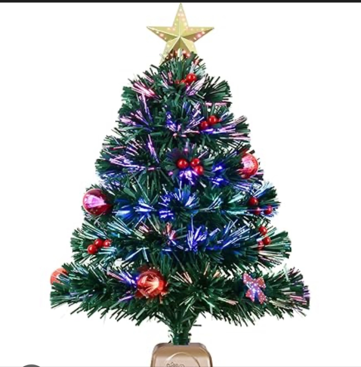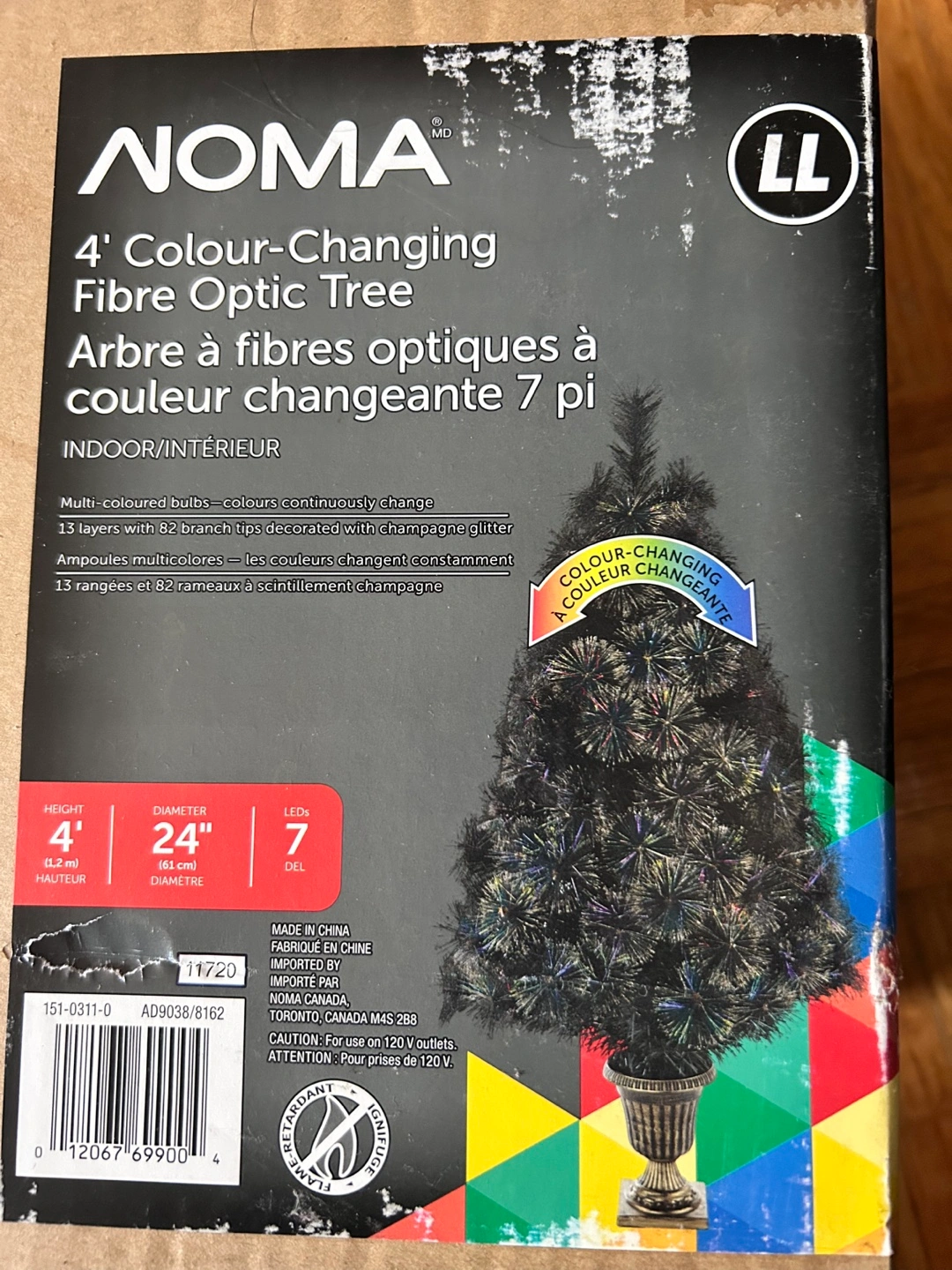 Selling a NOMA 4' Colour-Changing Fibre Optic Tree! It's an indoor tree that changes colours continuously. It has 13 layers with 82 branch tips decorated with champagne glitter. The tree is 4' (1.2m) in height and 24" (61cm) in diameter and has 7 LEDs