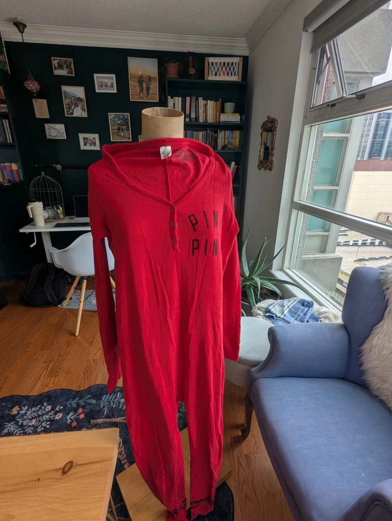 Cozy up in this PINK thermal onesie! It's a vibrant red and super comfy for lounging around the house. Size large.