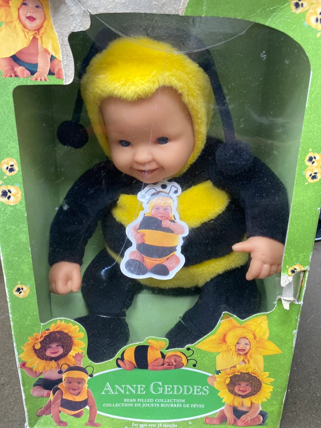Selling an Anne Geddes bean filled doll dressed as a bee! It's from the collection de jouets bourrés de fèves. Recommended for ages over 18 months. The box is included!
