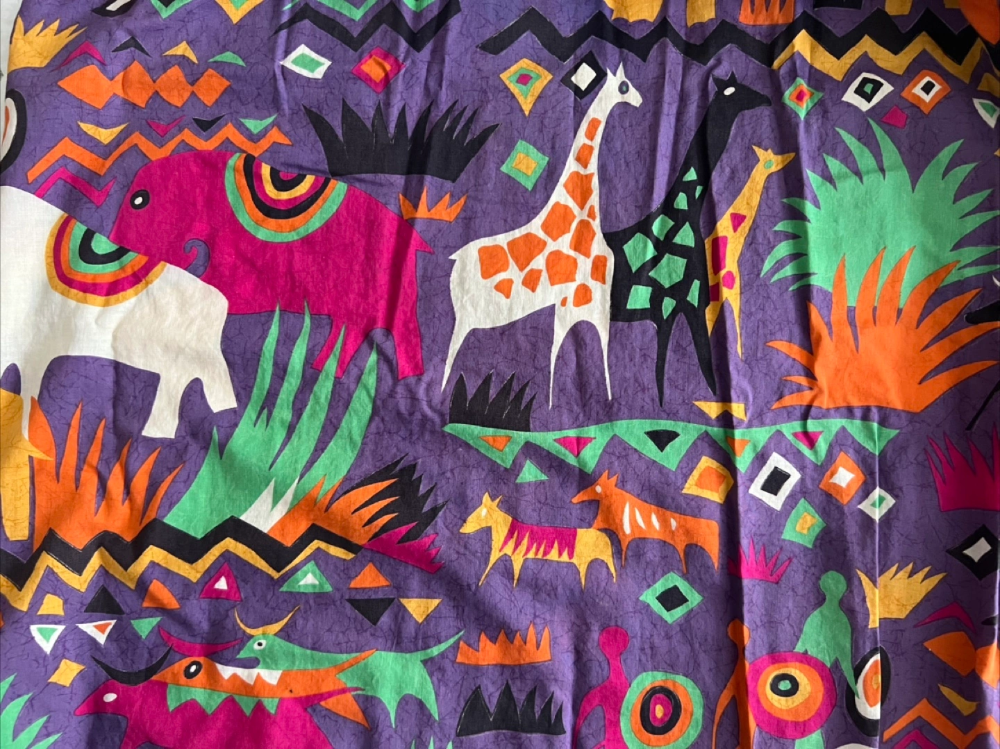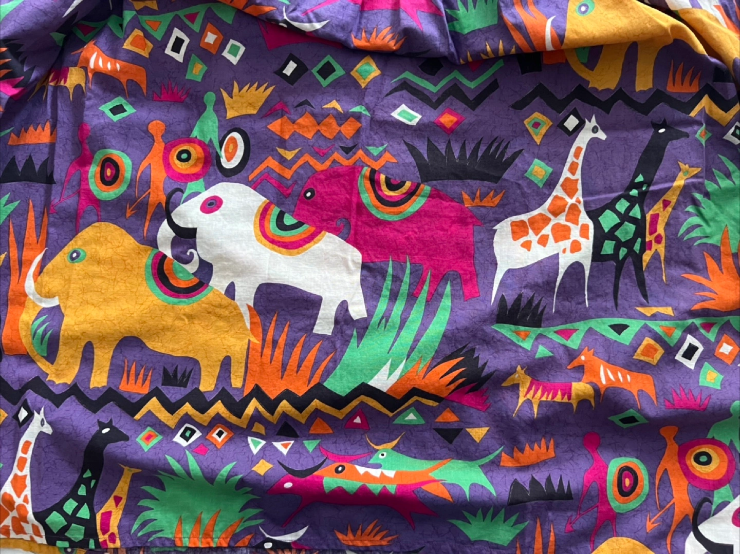 Selling a vintage Batya skirt from the 1980’s featuring a vibrant animal print! The skirt has a unique and colorful design with elephants and giraffes on a purple background. Has pockets. 100% cotton.