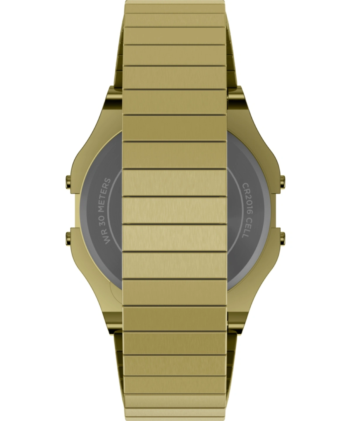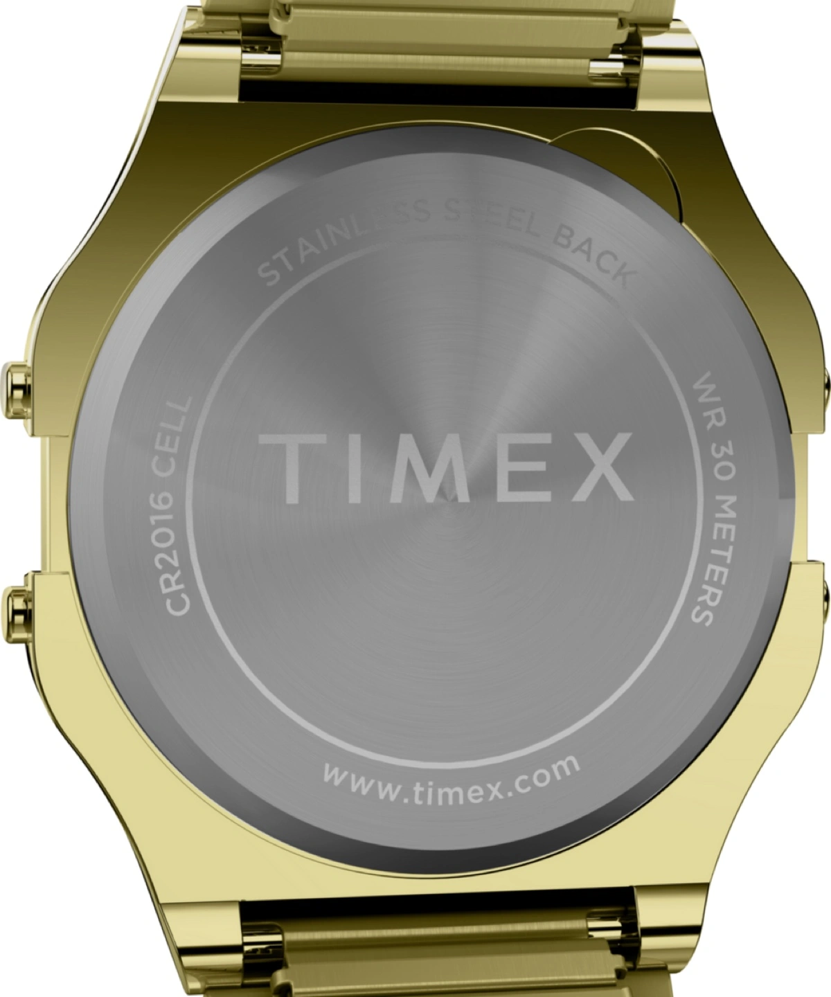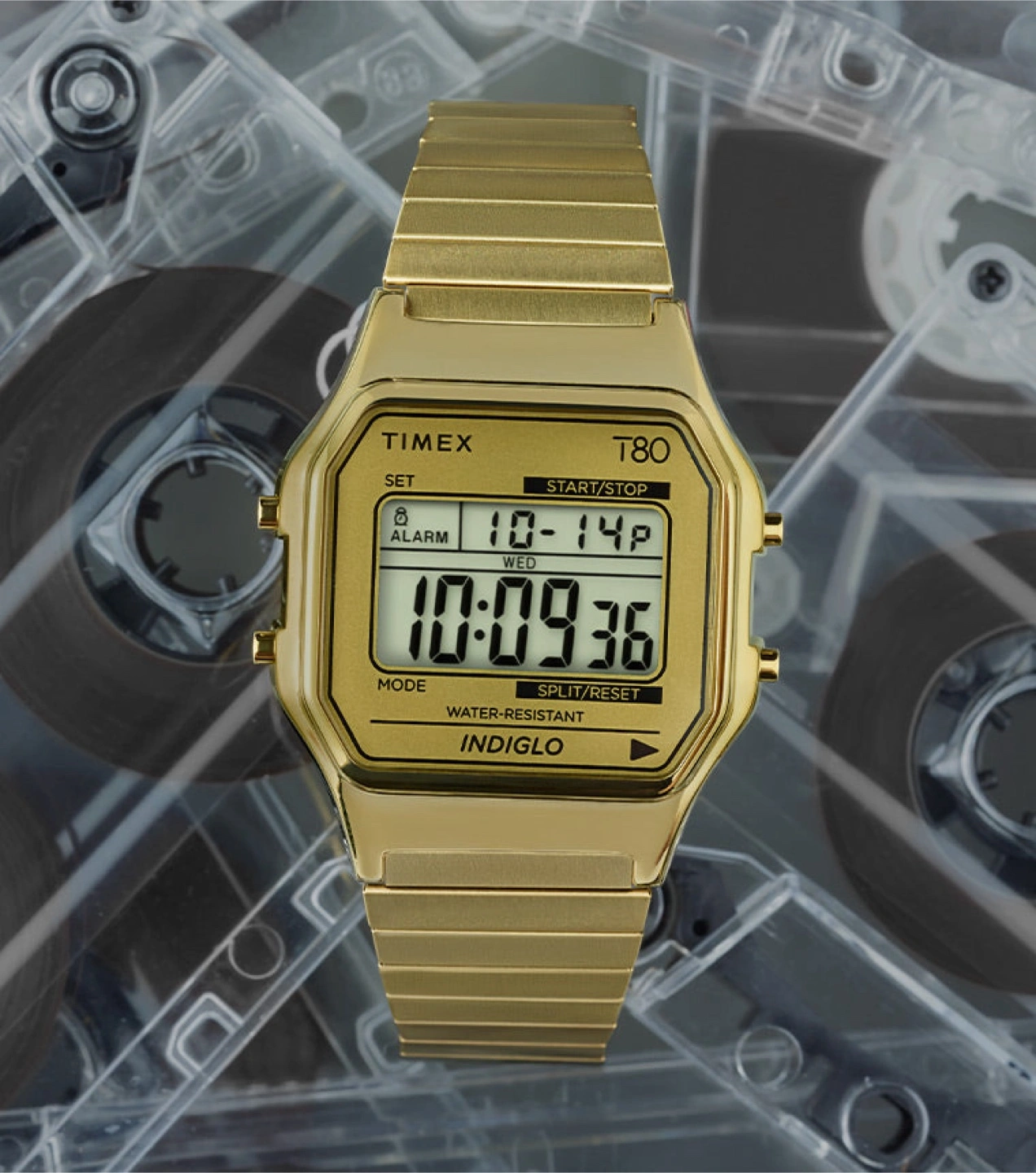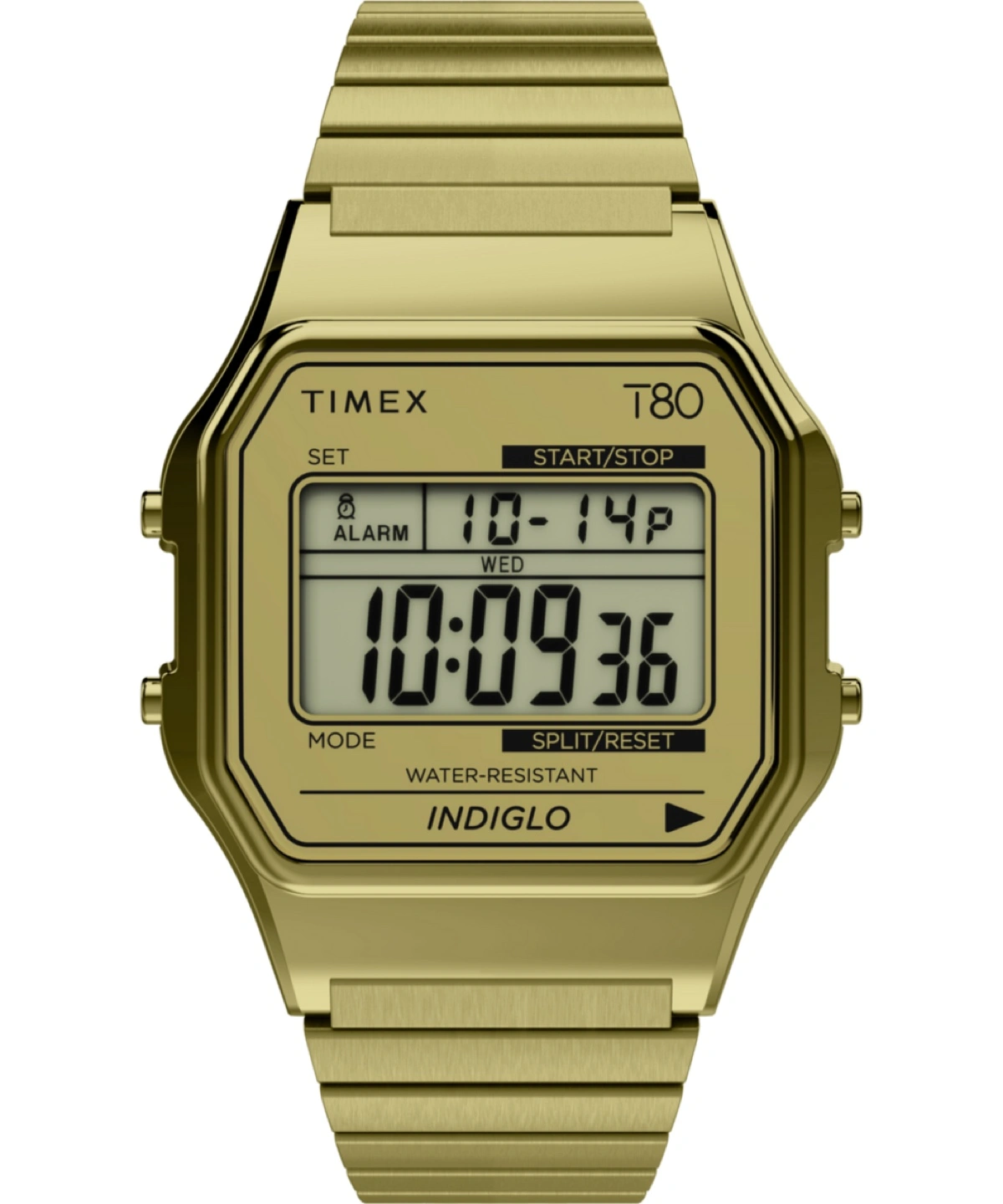 Selling a Timex T80 digital watch in gold! It's a retro-cool timepiece with a stainless steel back. The watch is water-resistant up to 30 meters and features an Indiglo night-light for easy reading in the dark. A classic style for everyday wear!