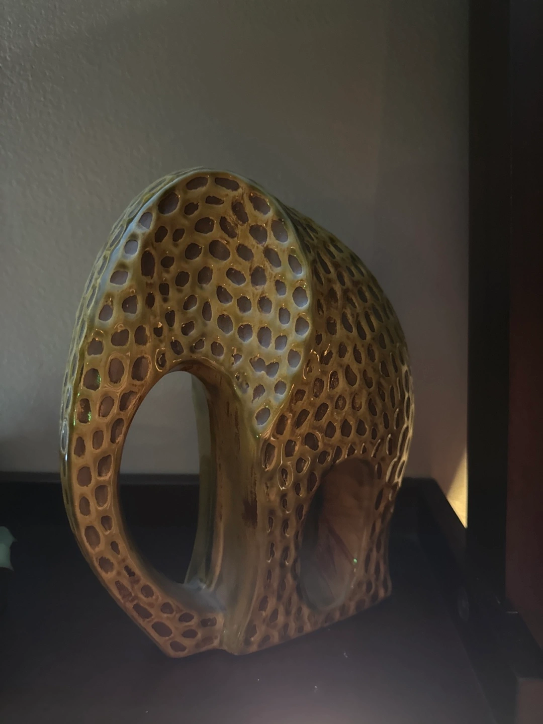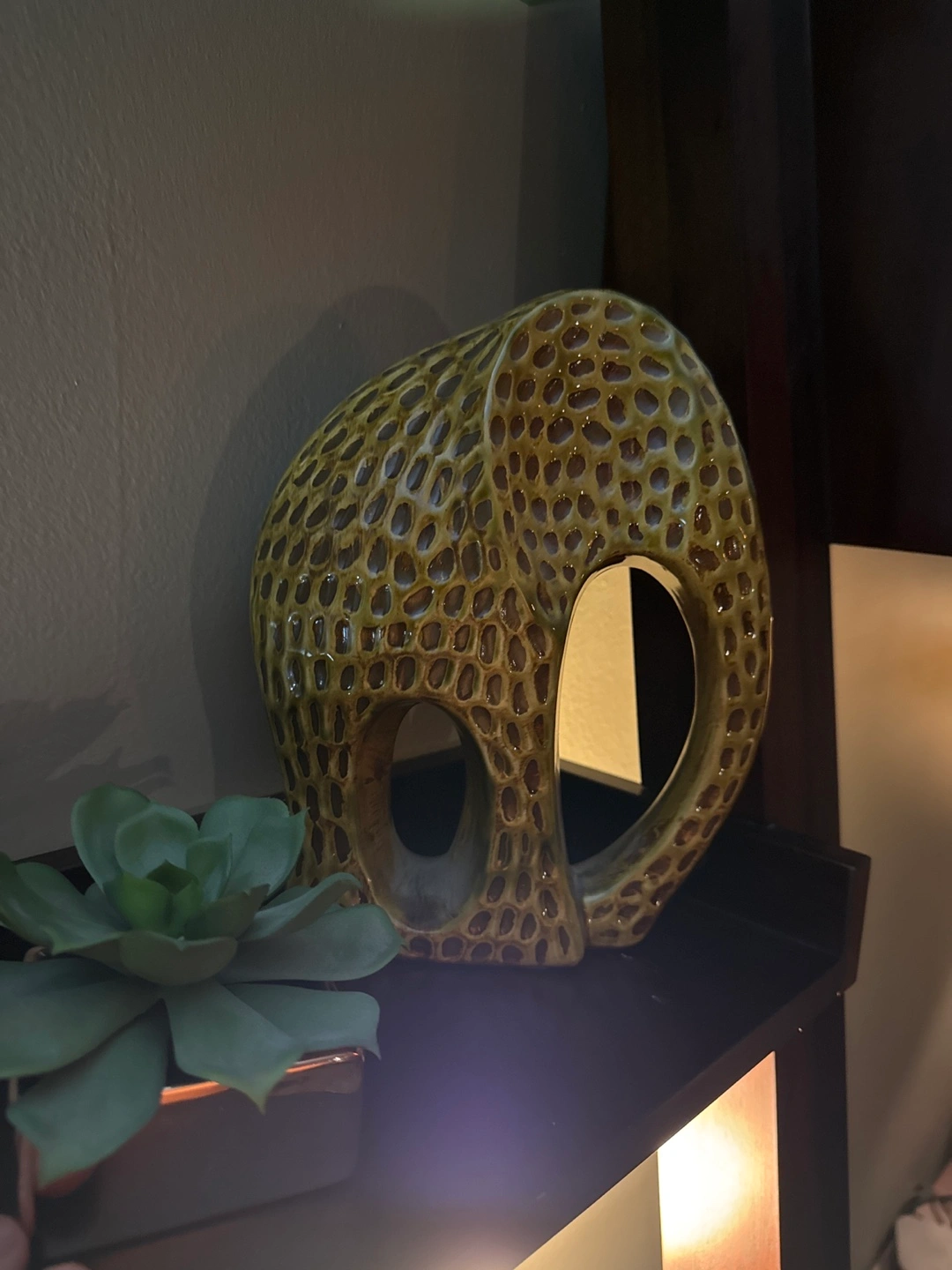 This unique elephant figurine is a great way to add some character to your home decor! It features a distinctive design with a textured surface and cut-out shapes. Perfect as a decorative accent on shelves or tables.