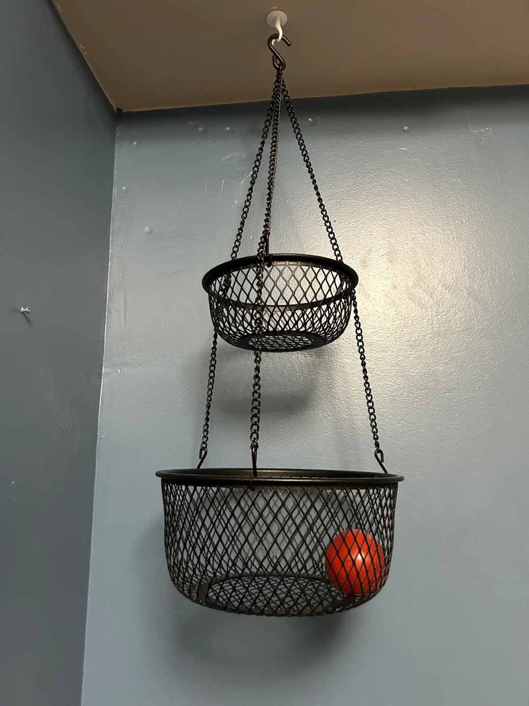 Selling a two-tiered hanging wire basket. It's perfect for storing fruits and veggies in the kitchen, or for organizing other items around the house. The basket is black and in great condition! Perfect when you have a small kitchen with limited counter space.