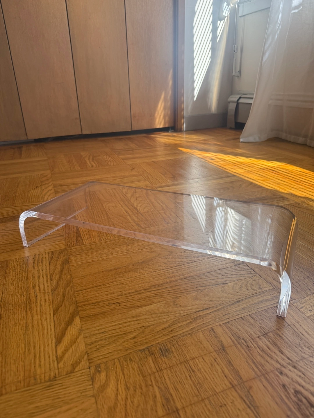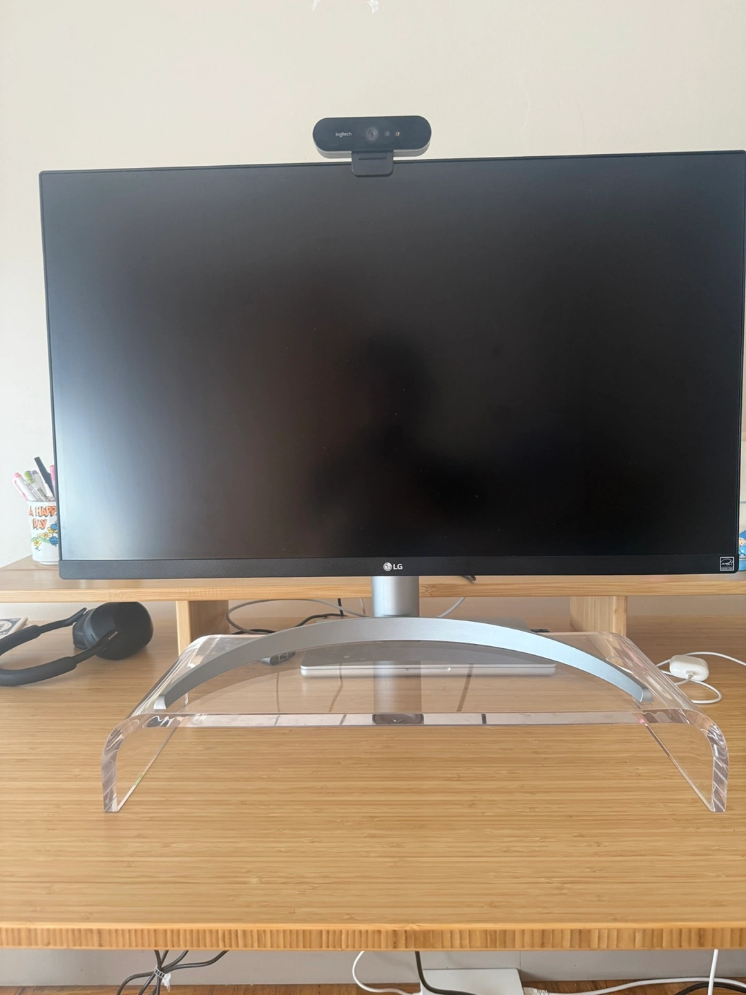 Selling a clear acrylic monitor stand. It's in great condition and perfect for raising your monitor to a more comfortable viewing height. It's a simple and stylish way to organize your desk and reduce neck strain