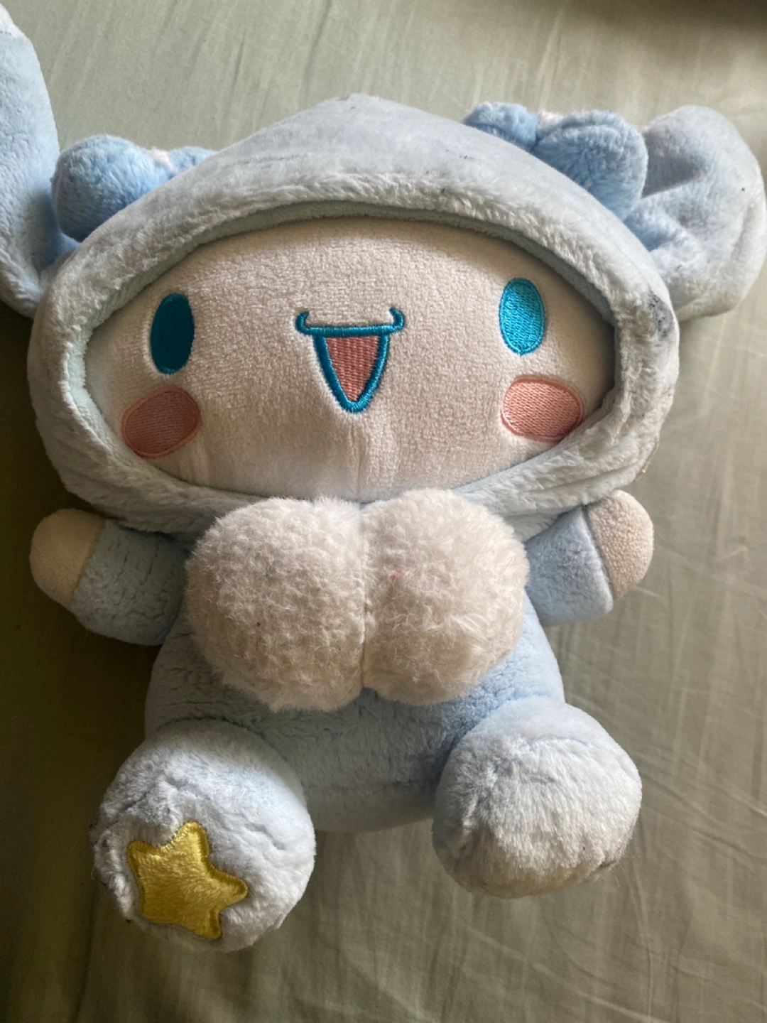 A cute Cinnamoroll plushie is looking for a new home! It's wearing a light blue hoodie and has a sweet smile. A star is embroidered on the foot. Perfect for any Cinnamoroll fan!