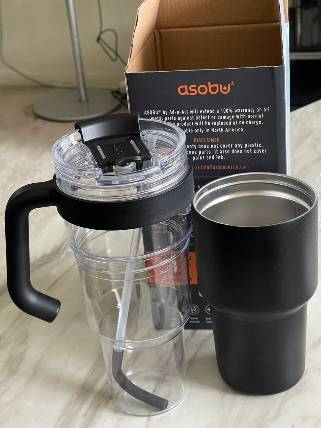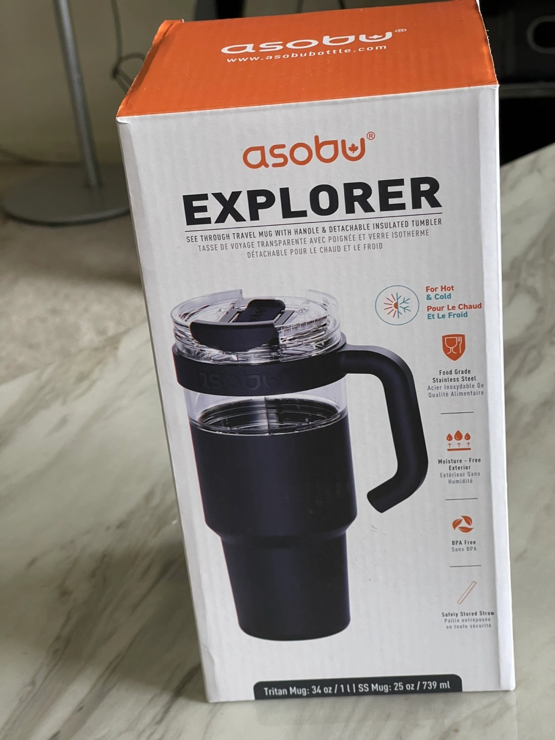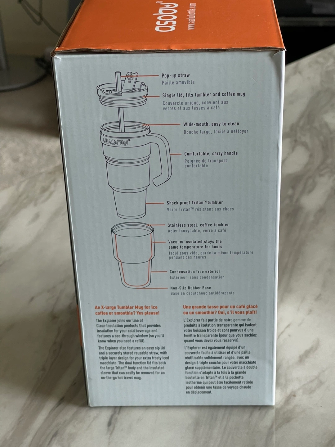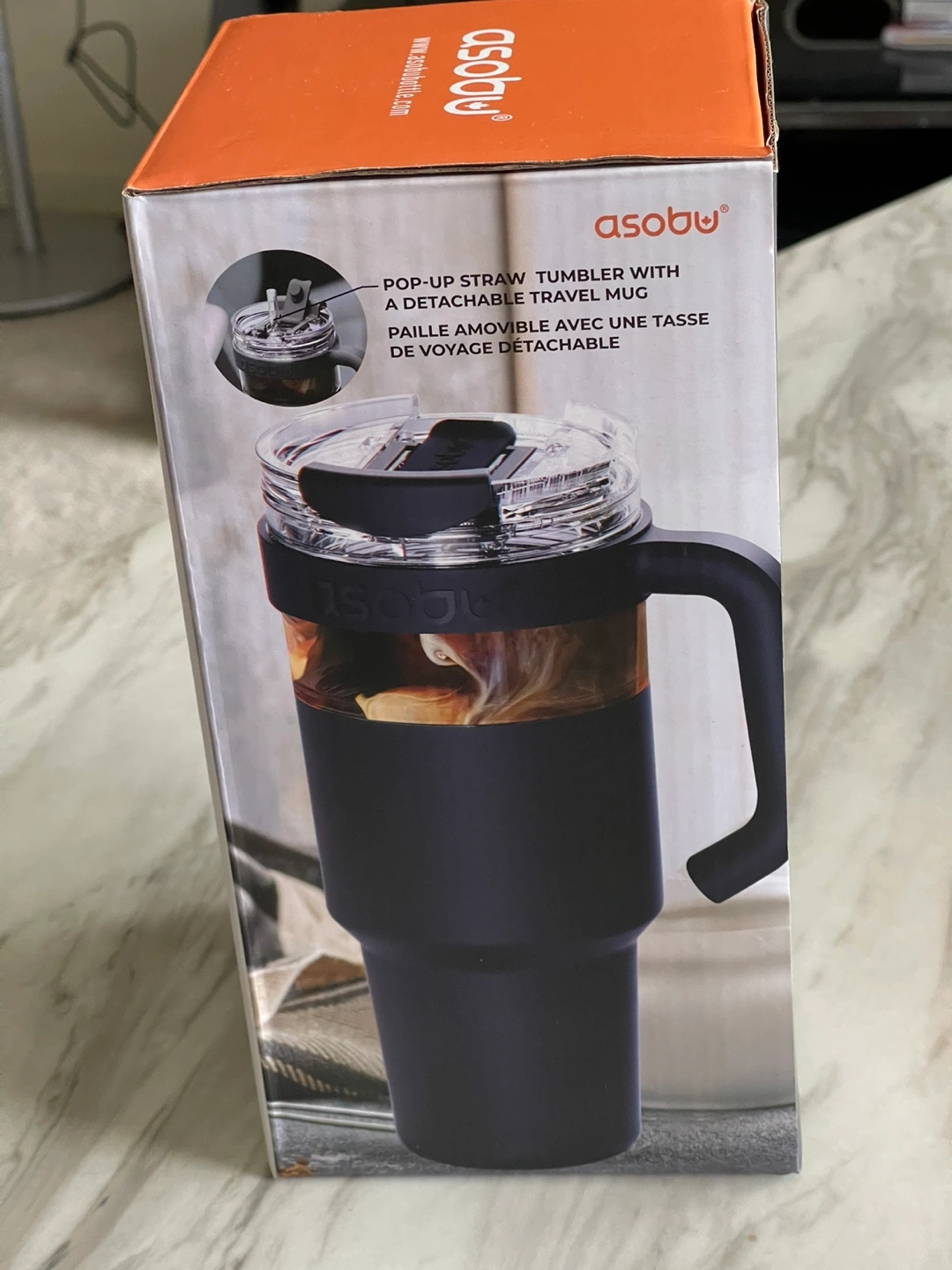 I'm selling a brand new Asobu Explorer Tumbler! It's a pop-up straw tumbler with a detachable travel mug. It's made of shock proof Tritan™ tumbler. It features a wide-mouth that's easy to clean and a comfortable carry handle. It's also condensation free and has a non-slip rubber base. Keeps your drink the same temperature for hours! The box is included .