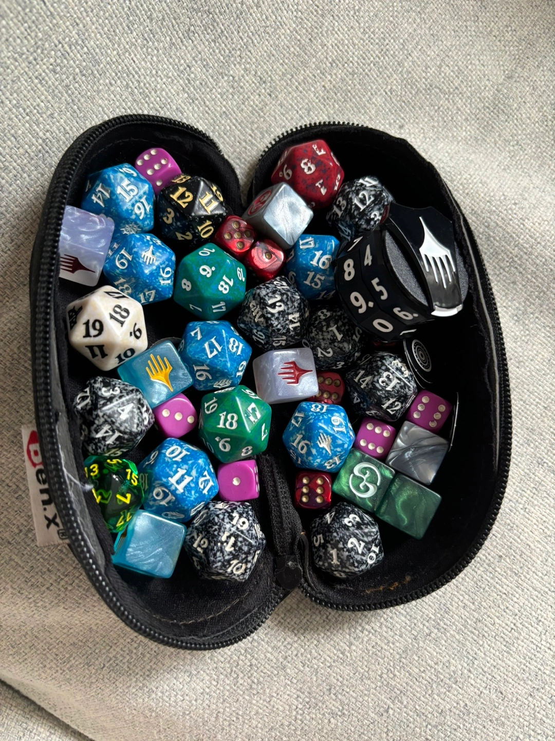 Selling a collection of various dice as bulk Great for tabletop games like Dungeons and Dragons and Magic the Gathering ! The dice come in different colours and styles. There are d20 dice from older MTG sets, counter dice and life counters as well as d6 dice. 🎲 enjoy your games ! Only selling it as a bulk. I’ll give you a huge dice bag as well !