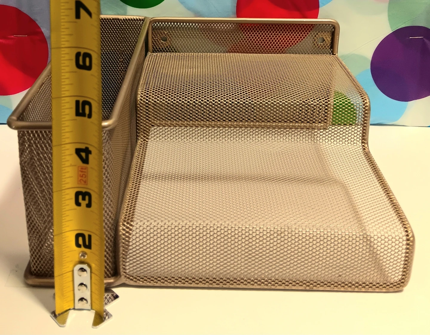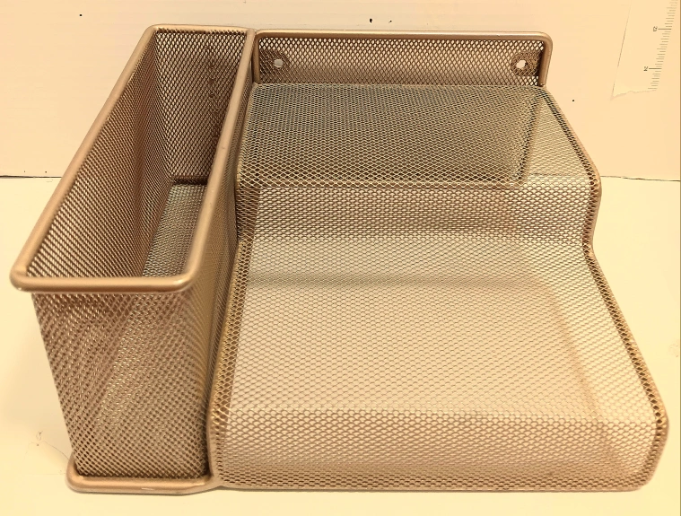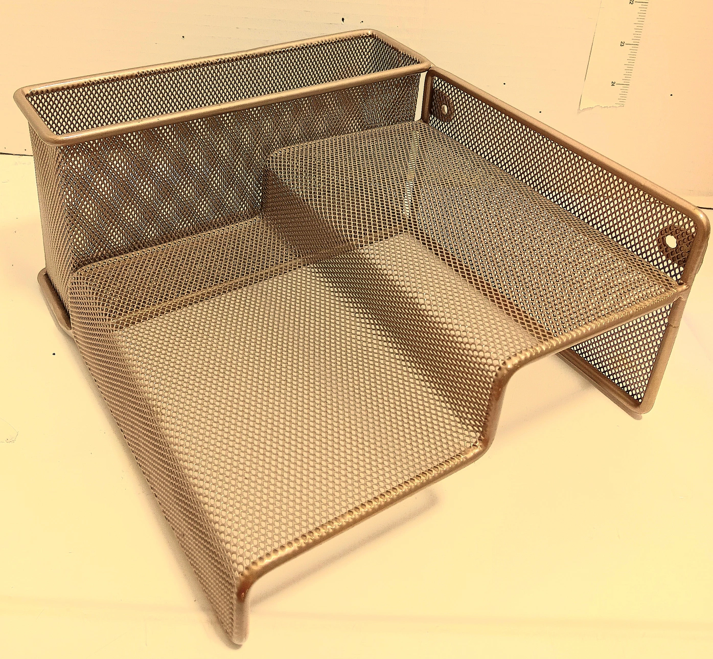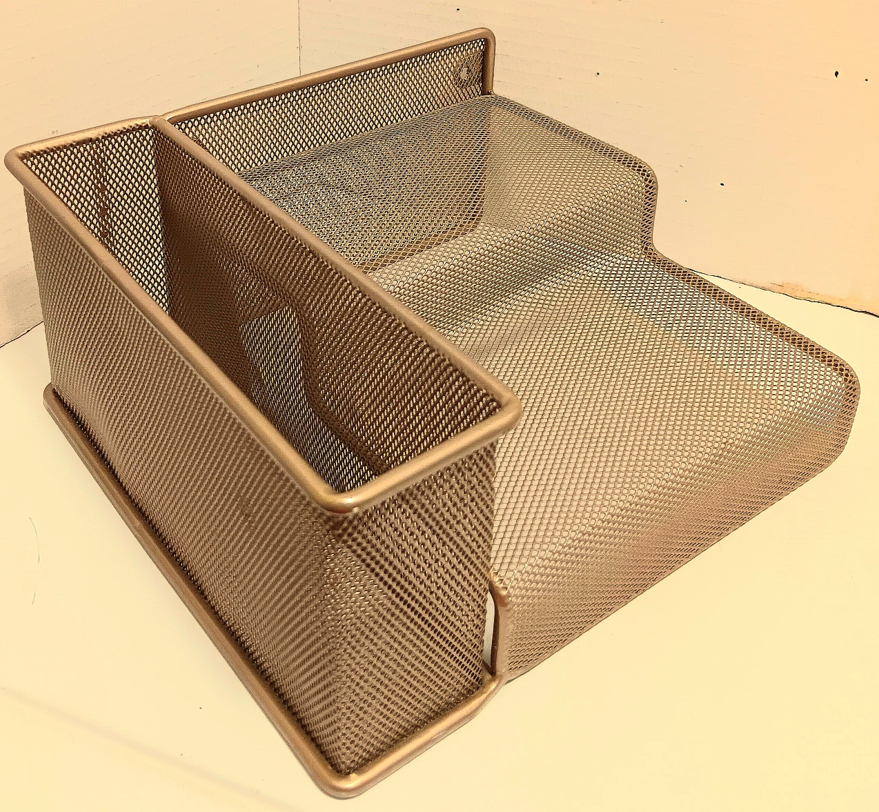 Organize your workspace with this gold metal mesh desk organizer, perfect for holding files and supplies, ensuring everything is within easy reach. The organizer has a sleek, industrial look that complements any office decor.