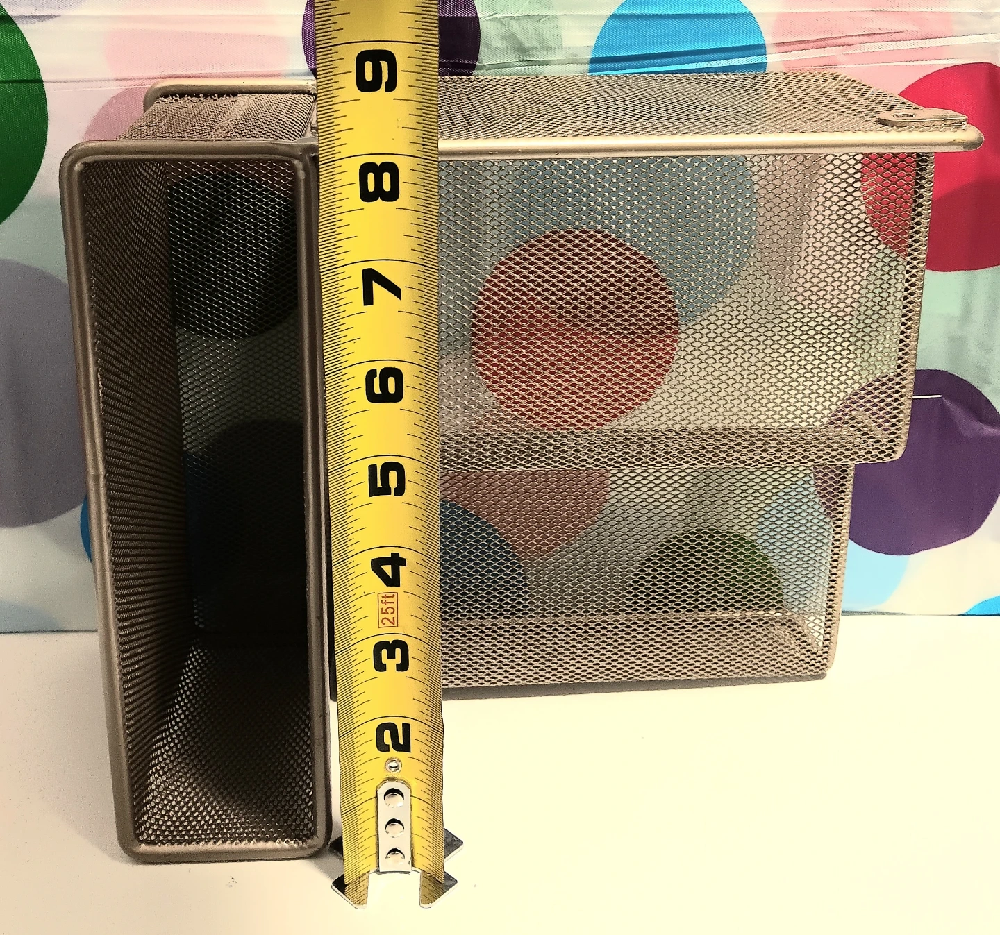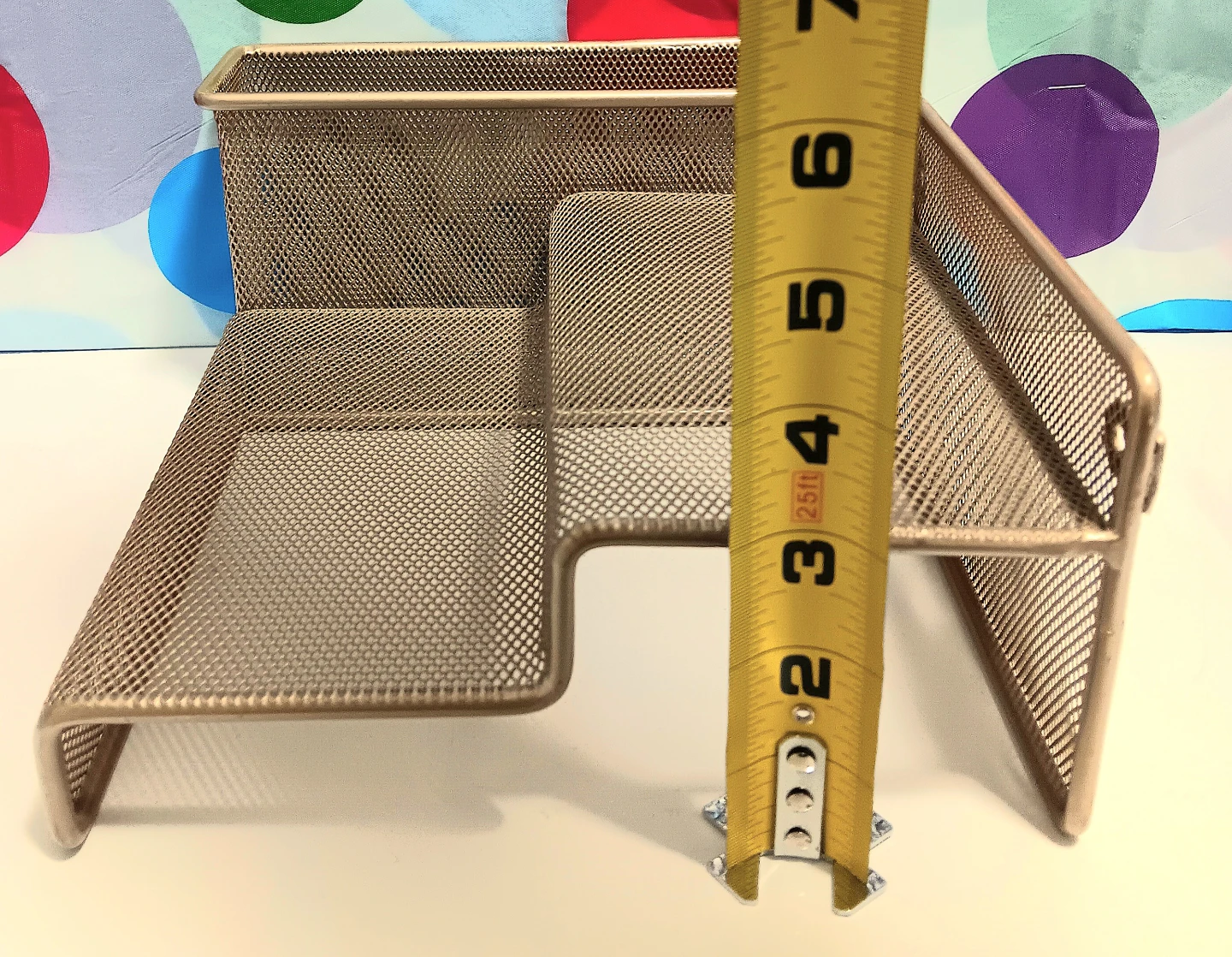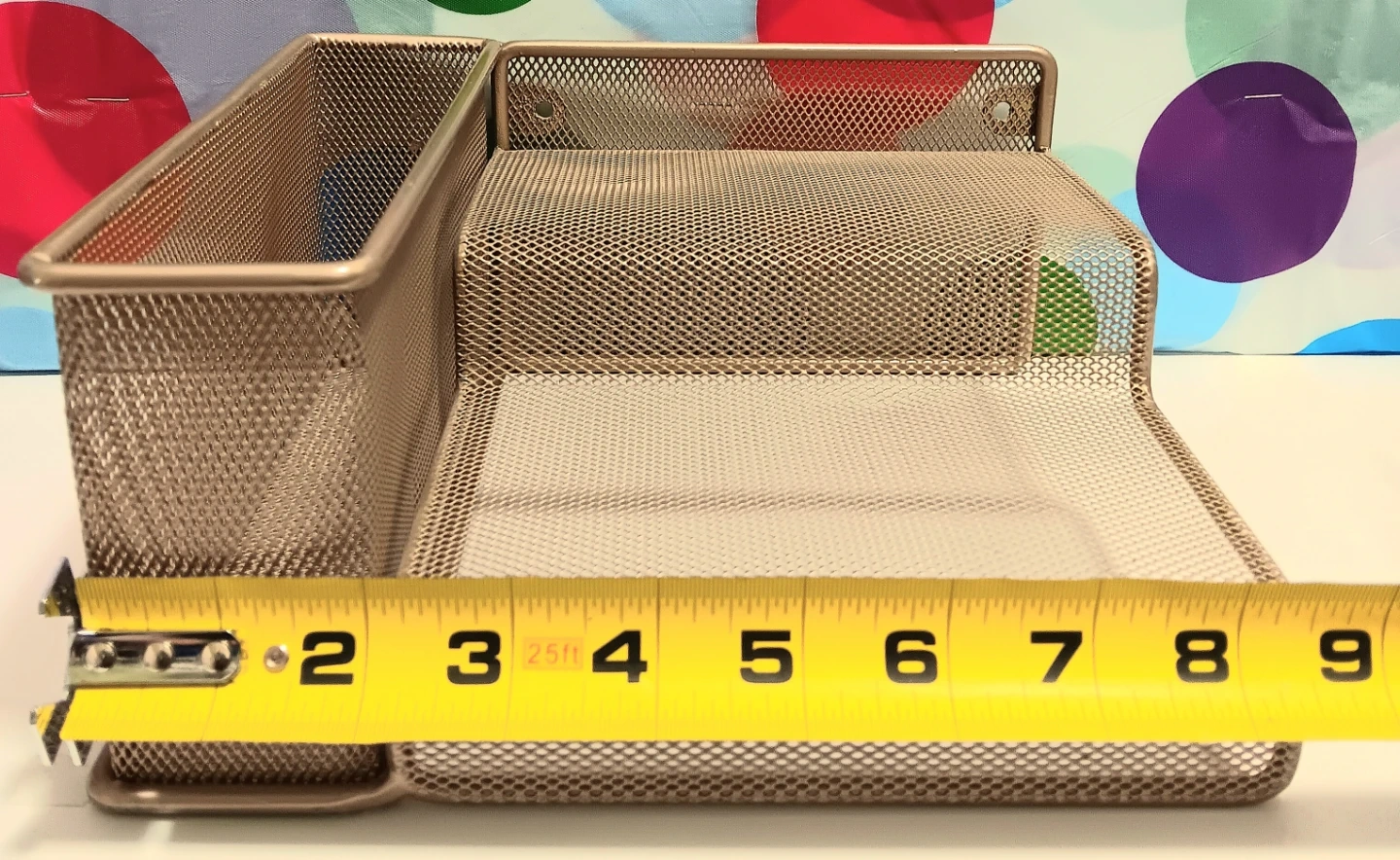 Organize your workspace with this gold metal mesh desk organizer, perfect for holding files and supplies, ensuring everything is within easy reach. The organizer has a sleek, industrial look that complements any office decor.