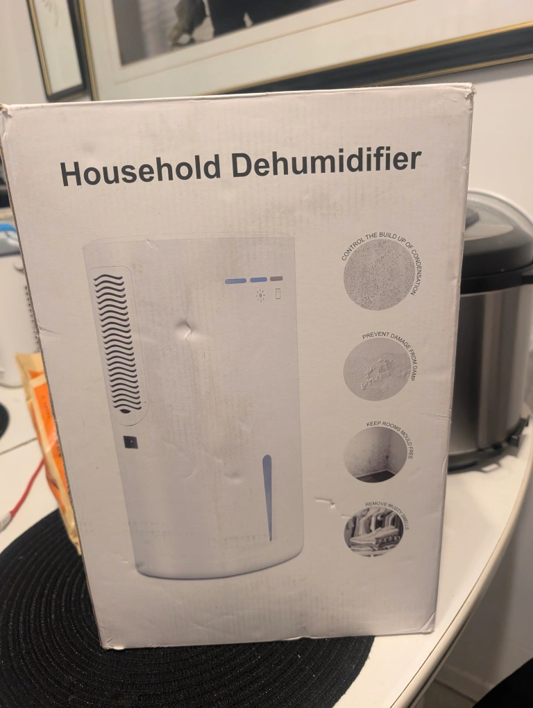 Selling a household dehumidifier! It comes with the box. This dehumidifier is designed to control the build-up of condensation, prevent damage from damp, keep rooms mould-free, and remove moisture from the air.New 2 litter in box.