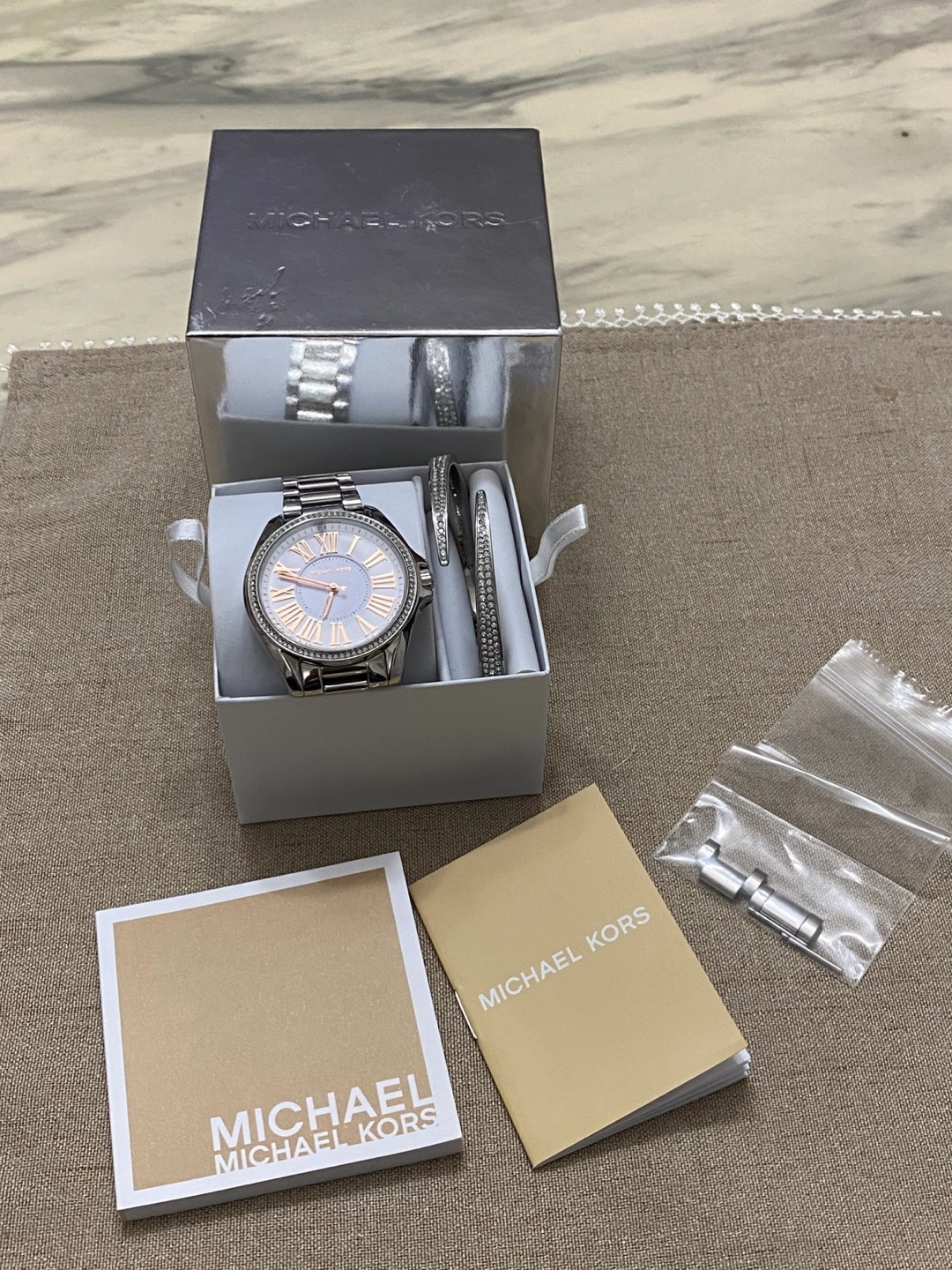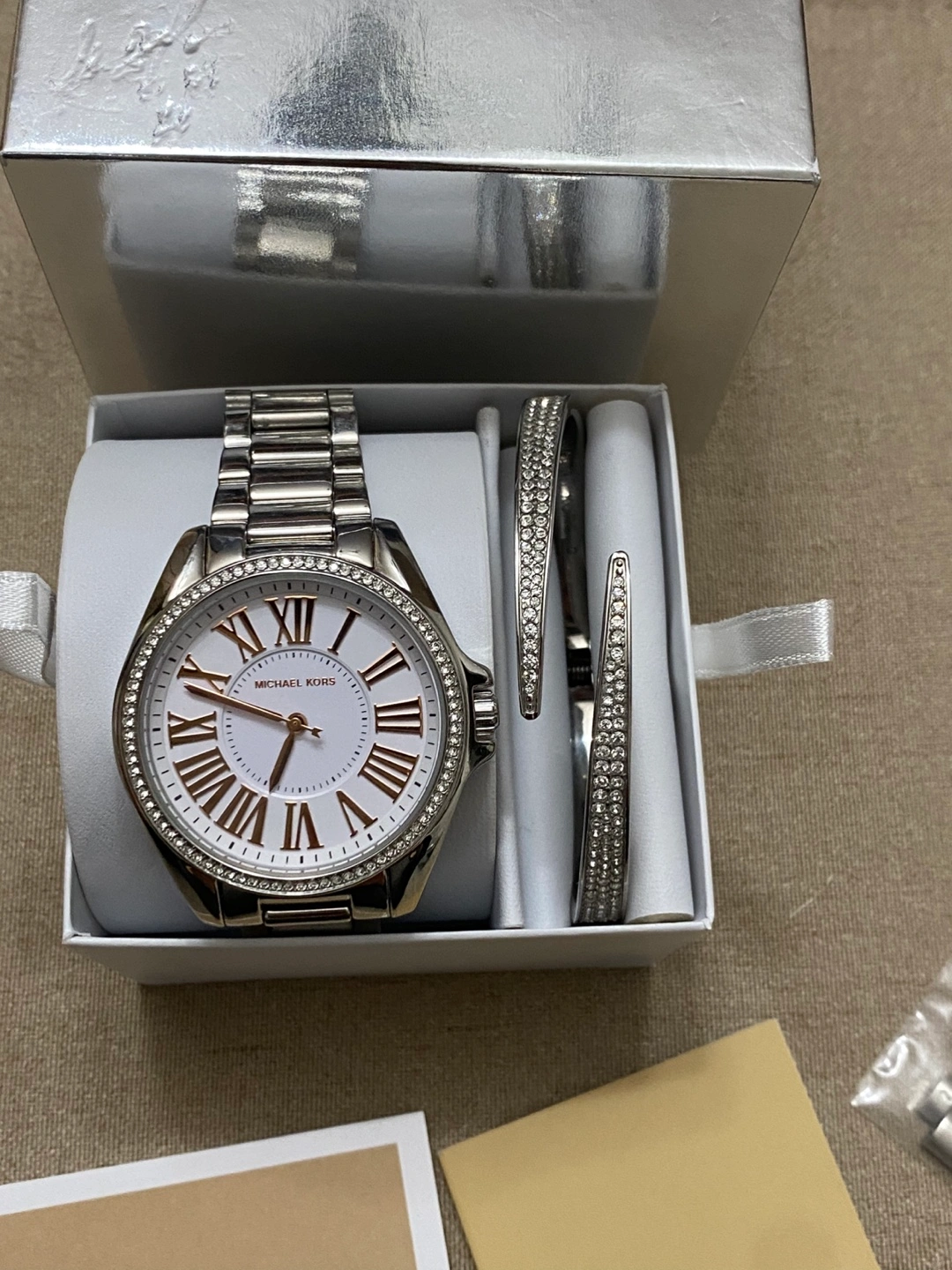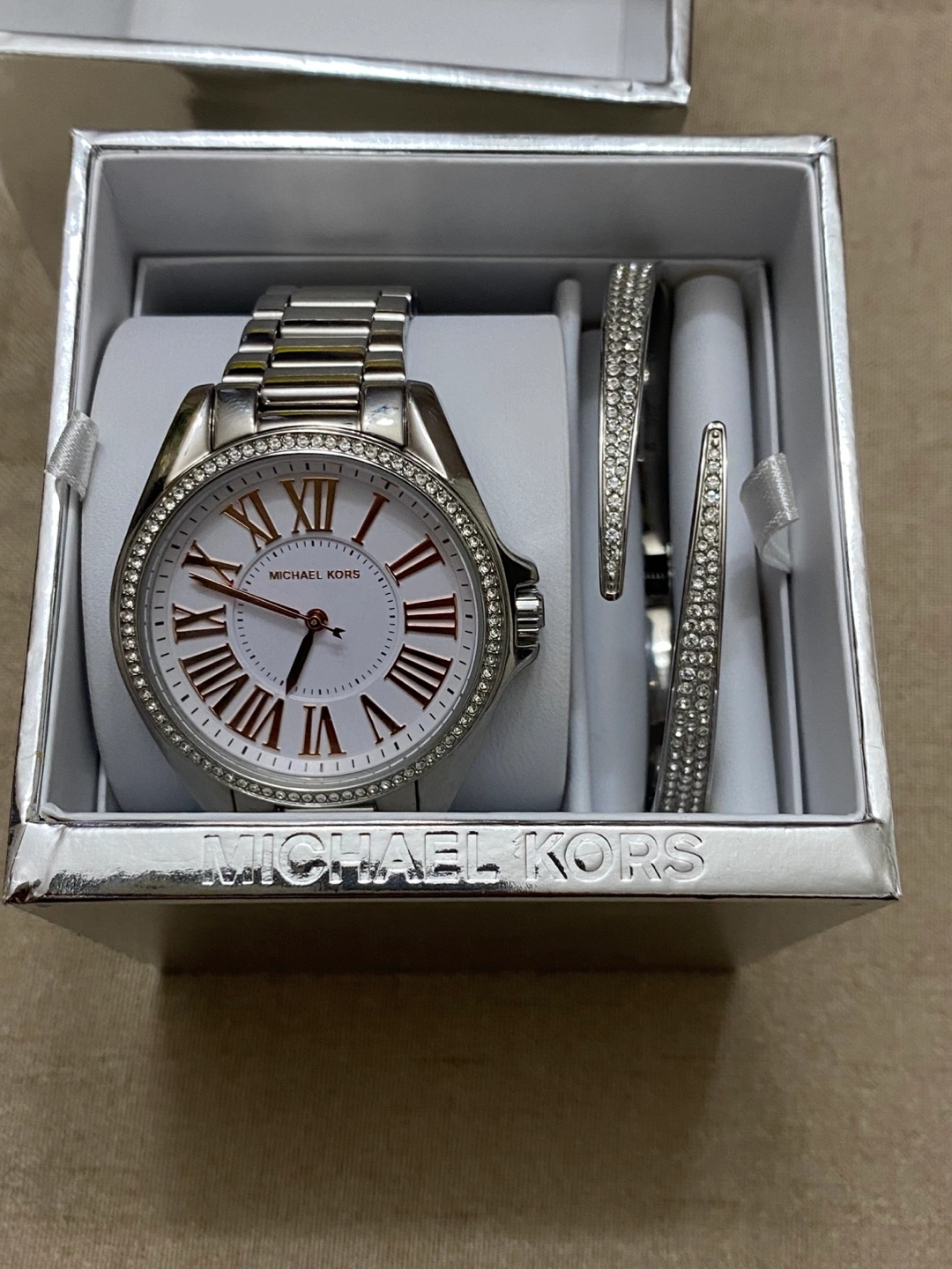 Selling a beautiful Michael Kors watch and bracelet set! The watch features a stainless steel band and a face with Roman numerals. It also comes with two matching bracelets, perfect for stacking or wearing separately. Includes the original box and extra links.