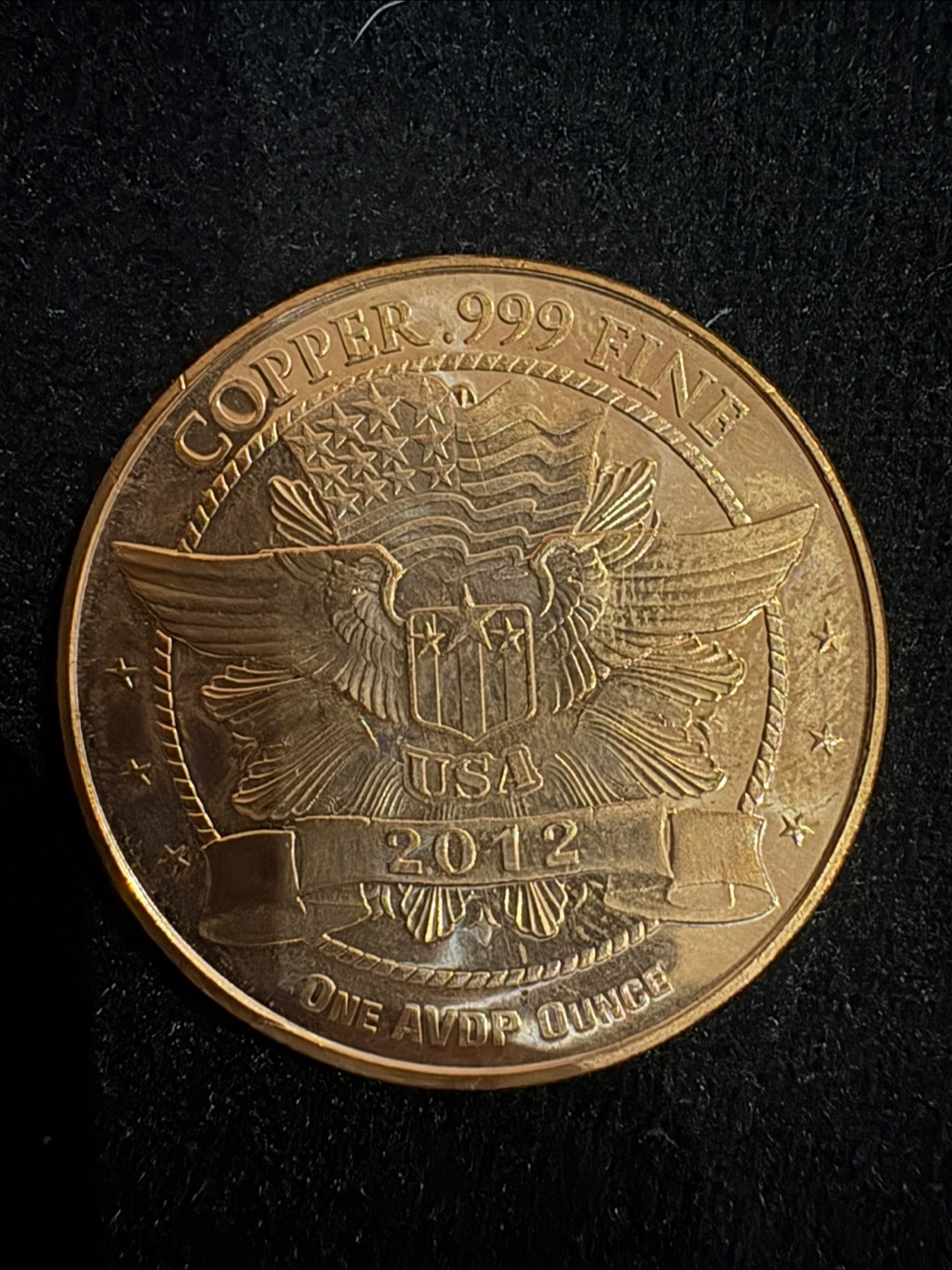 Selling a copper .999 fine coin. It features an eagle design on one side and a panda design on the other. The coin is marked 'USA 2012' and 'ONE AVDP OUNCE'.
