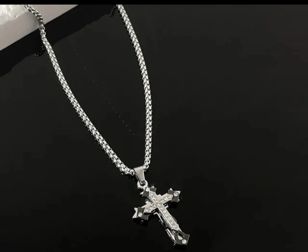 Selling a cross pendant necklace. It features a silver chain and a cross pendant adorned with small stones. It's in great condition and ready to wear! free delivery