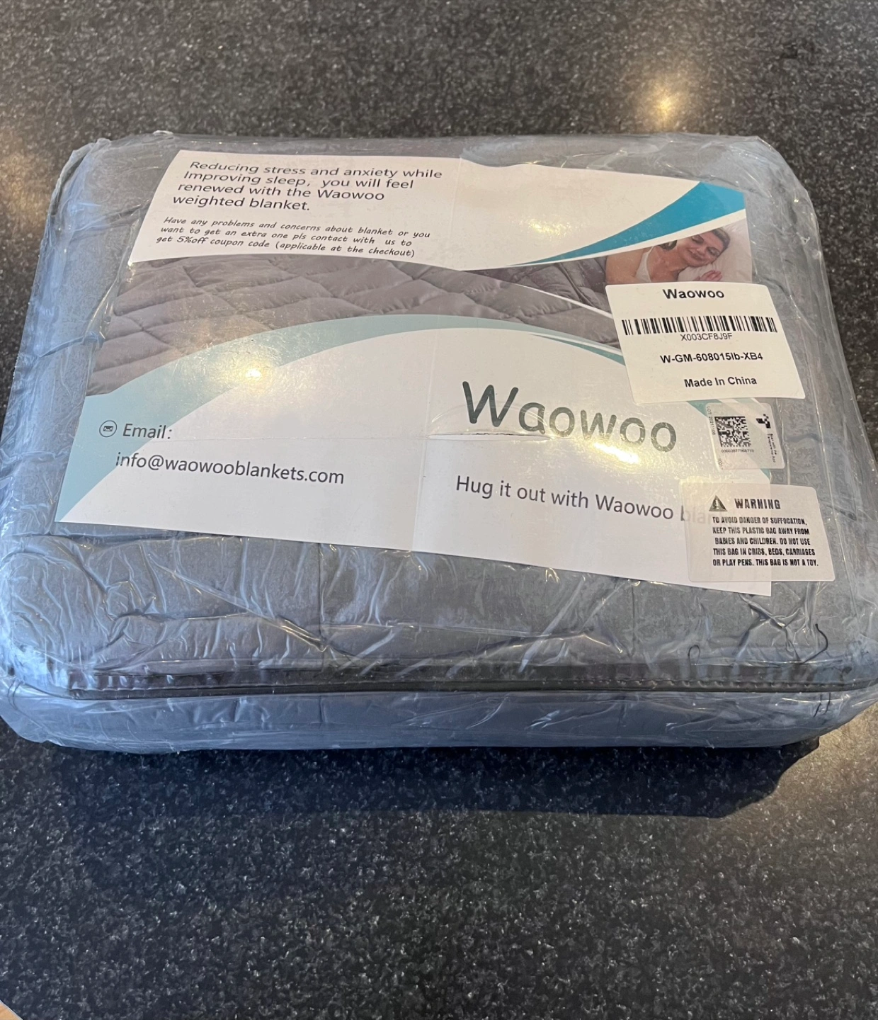 Brand new Waowoo adult weighted blanket in queen size! It's 15lbs and measures 60"x80". This heavy blanket has premium glass beads and is dark grey in colour. It's designed to reduce stress and anxiety while improving sleep