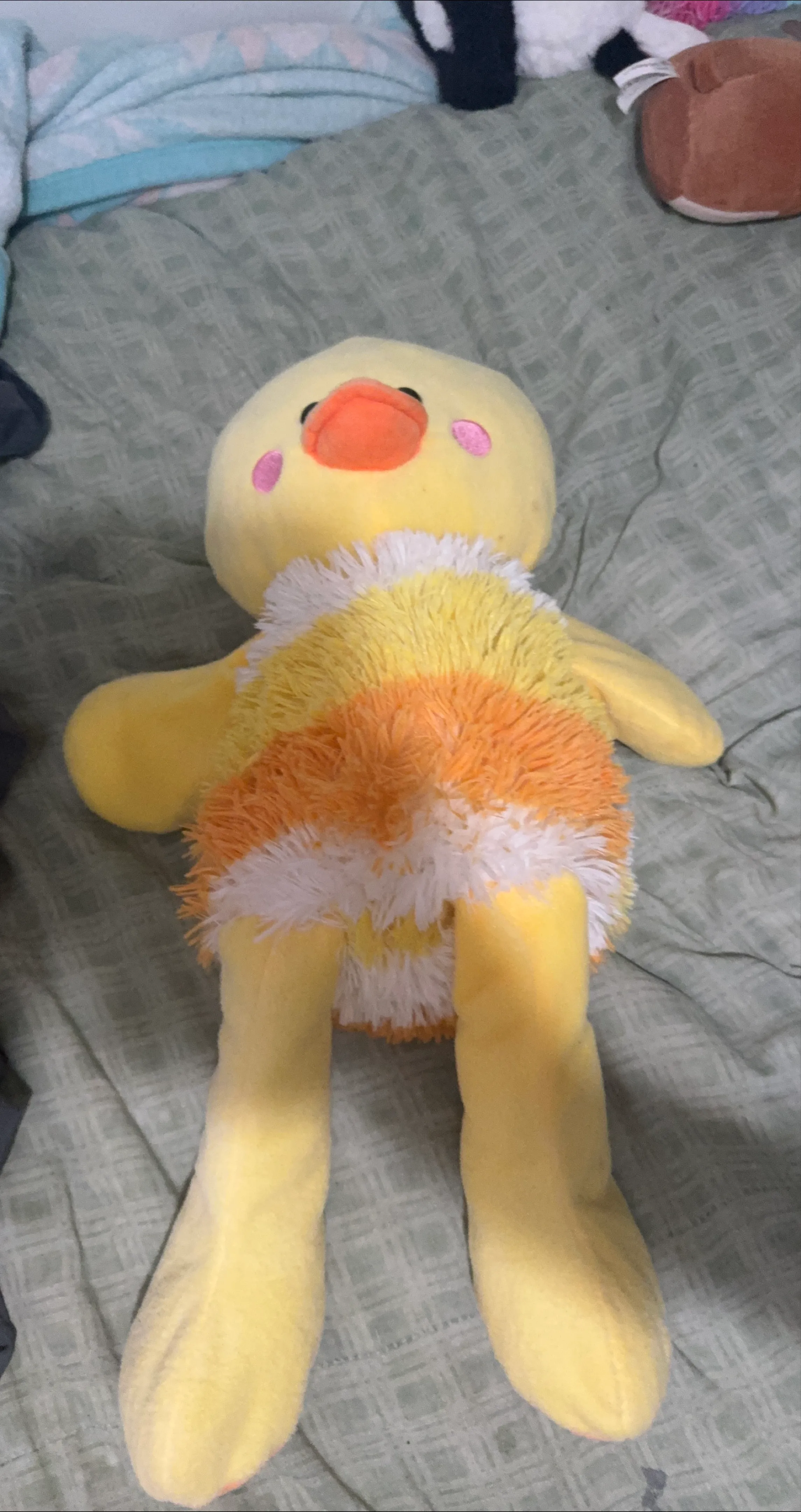 Selling a cute yellow duck plush toy! It has an orange beak and pink cheeks. The body is decorated with yellow, orange, and white fringe.