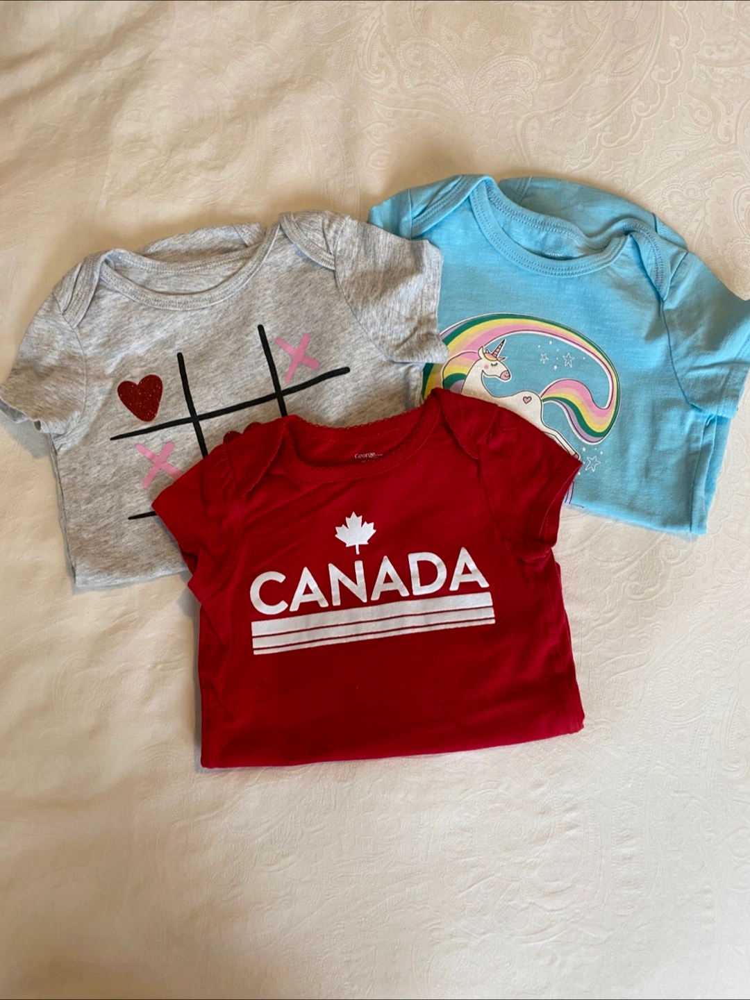 Selling a set of three adorable baby bodysuits from George. They're in great condition and ready for a new little one! The set includes: