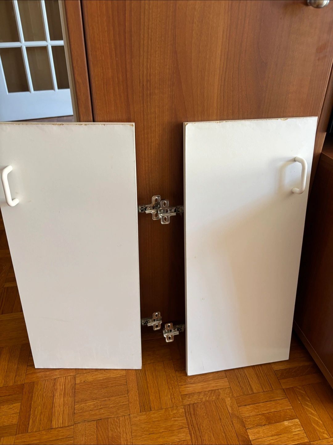 Selling a set of used white cabinet doors including hinges and screws. They're in okay condition. They measure 10 1/2 inches in width and the length is 23 inches.