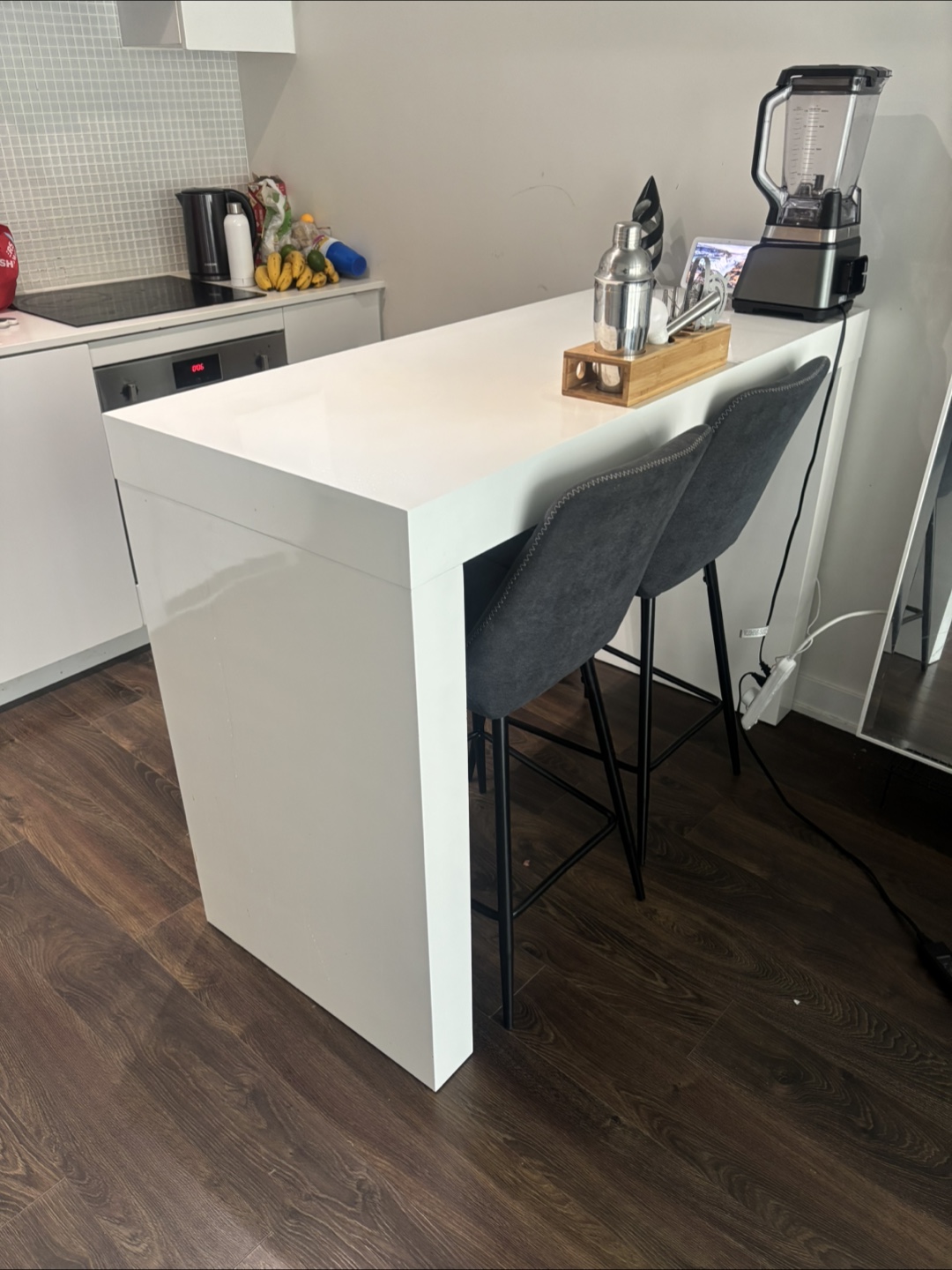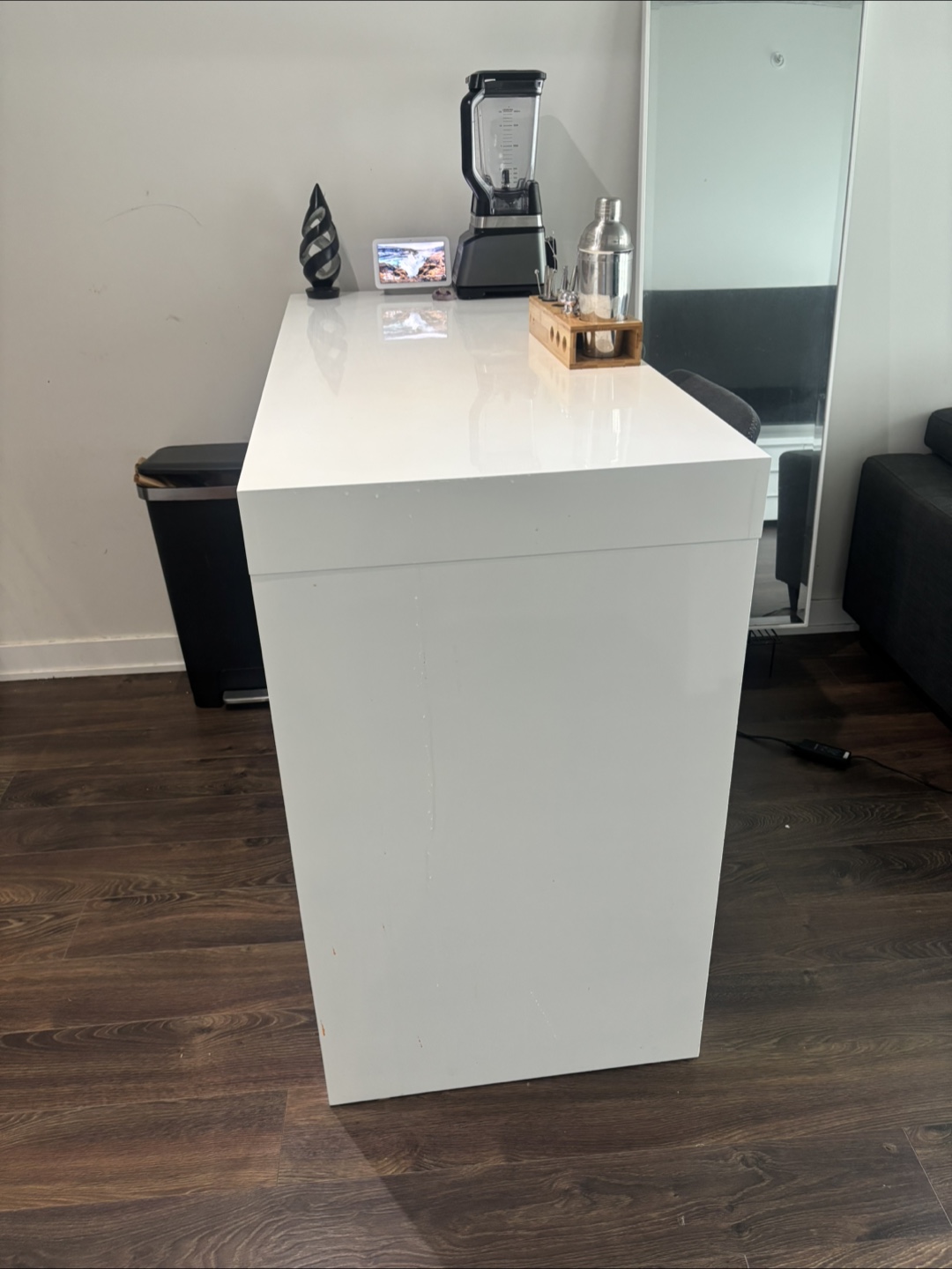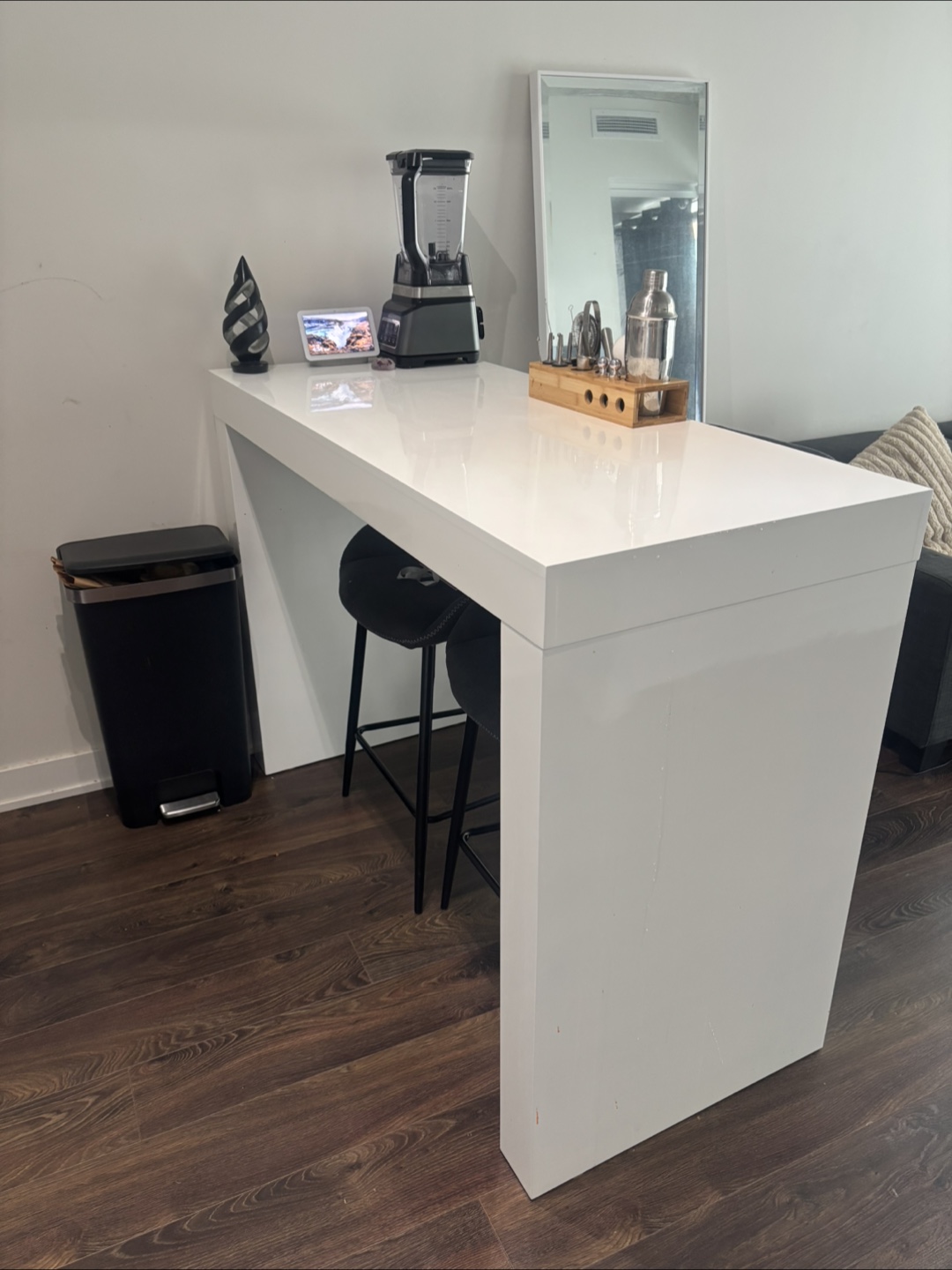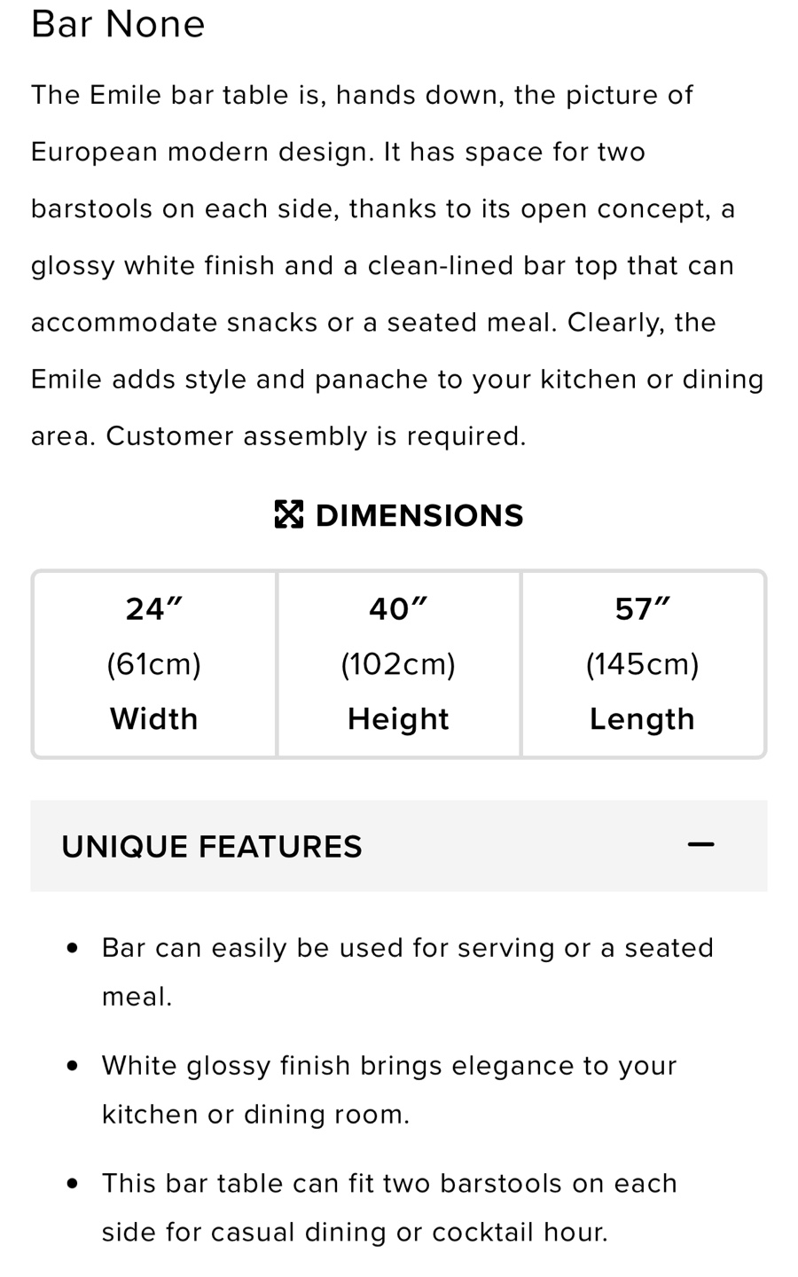 Selling an Emile bar table with a glossy white finish. It's designed in a European style and has space for two barstools on each side. It's great for serving snacks or enjoying a seated meal. Dimensions are 24" (width) x 40" (height) x 57" (length)