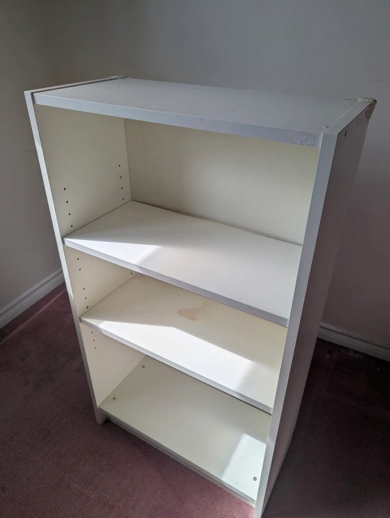 Selling a simple white bookcase. It has three shelves. There are some signs of wear and tear on the top and a stain on one of the shelves.