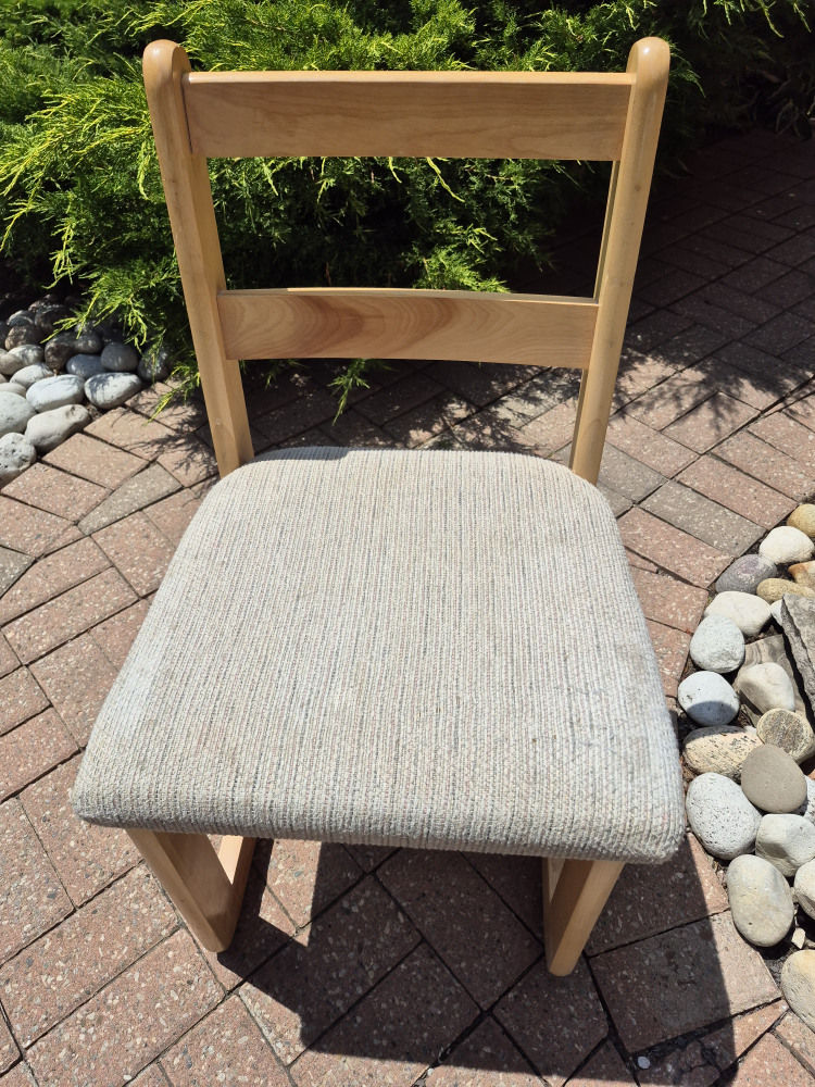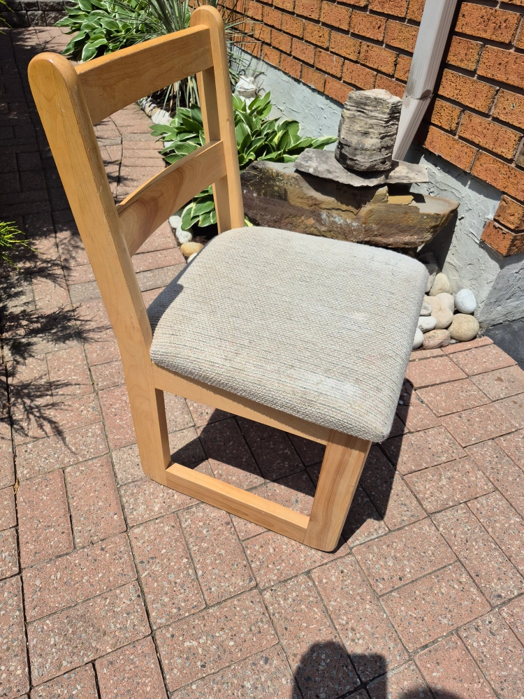 A simple wooden chair perfect for any room! It has a light beige fabric seat that's in great condition. The chair is sturdy and ready for a new home