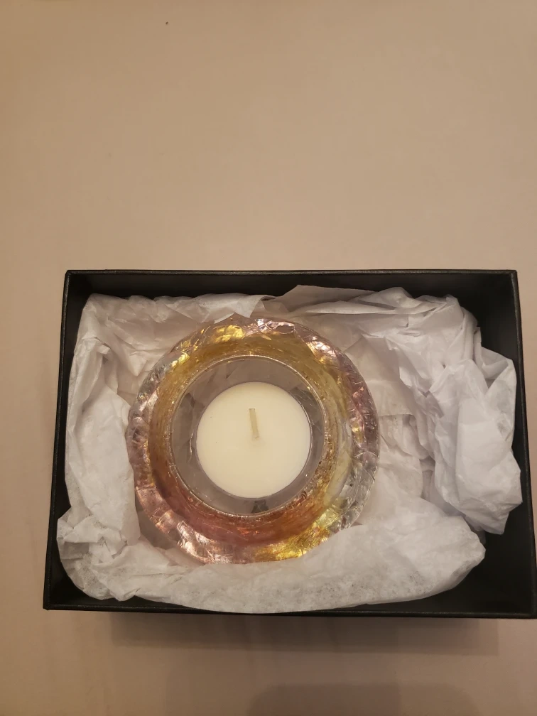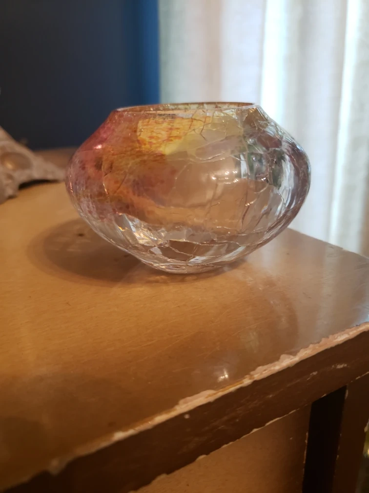 Selling a cute pink/orange/transparent crackle glass candle holder! The glass is smooth to the touch, it is not broken! It comes in its original box with a tea light and is in great condition. Perfect for adding a touch of cozy ambiance to any room