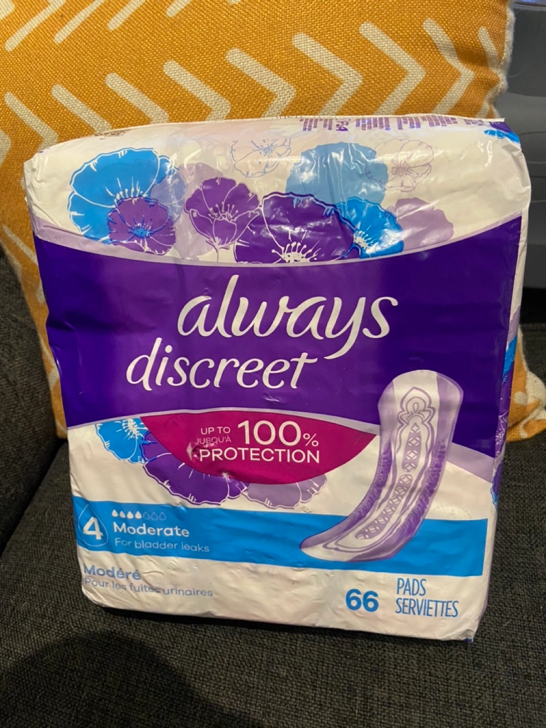 Selling 4 packages of Always Discreet pads for moderate bladder leaks. The package contains 66 pads and offers up to 100% protection