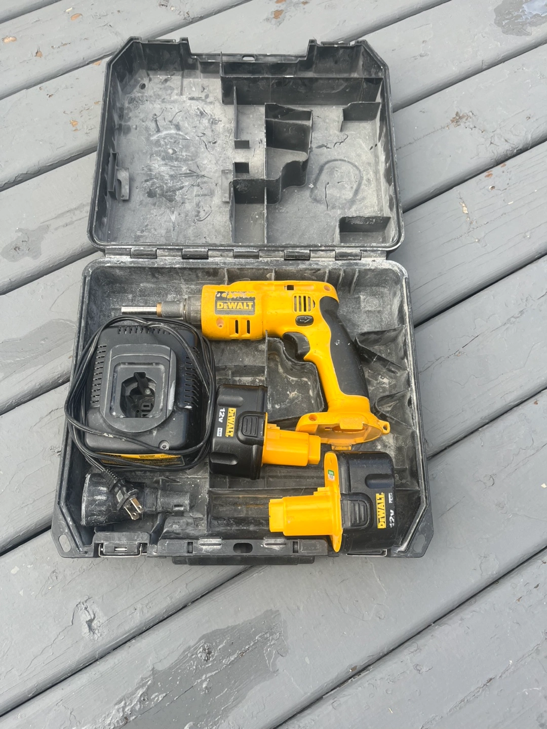 Selling a DeWalt 12V cordless drill/driver kit. It comes with the drill, two 12V batteries, a charger, and the carrying case. Great for various projects around the house!