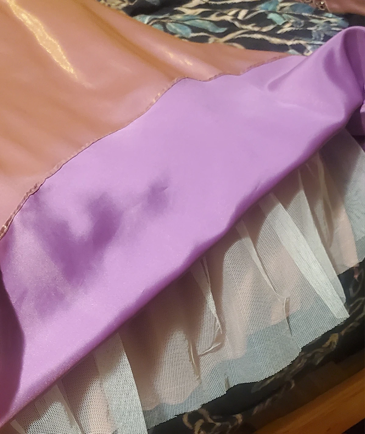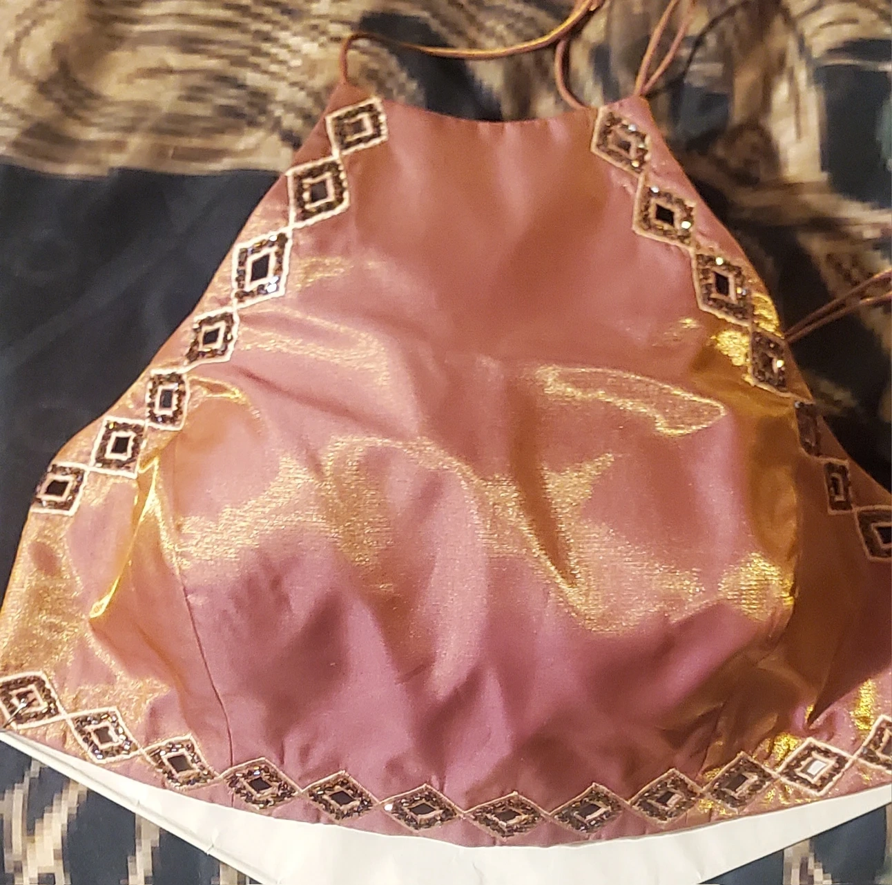 Stunning and sexy formal 2-piece gown. Iridescent organza material, mauve turns gold with lighting.