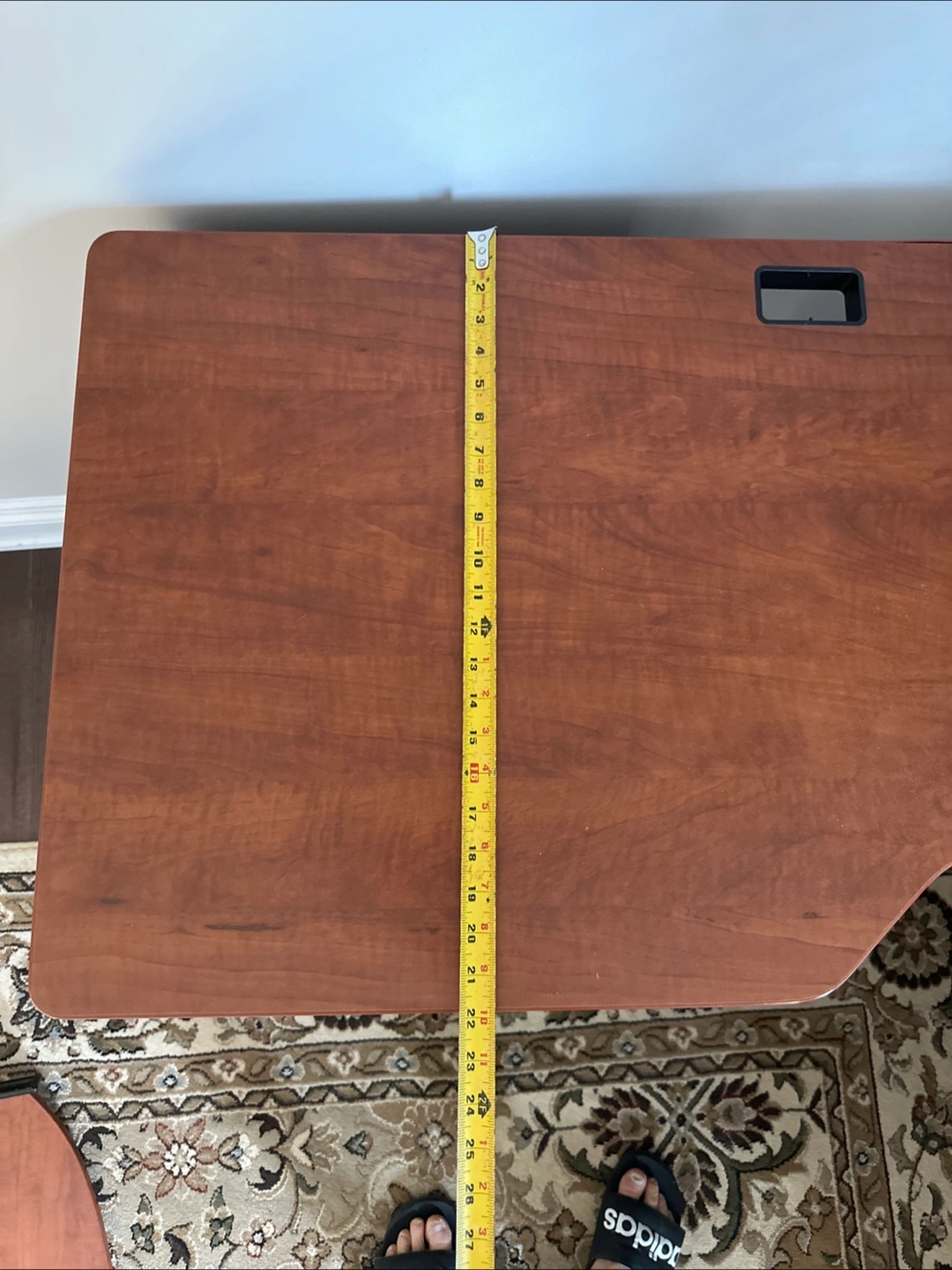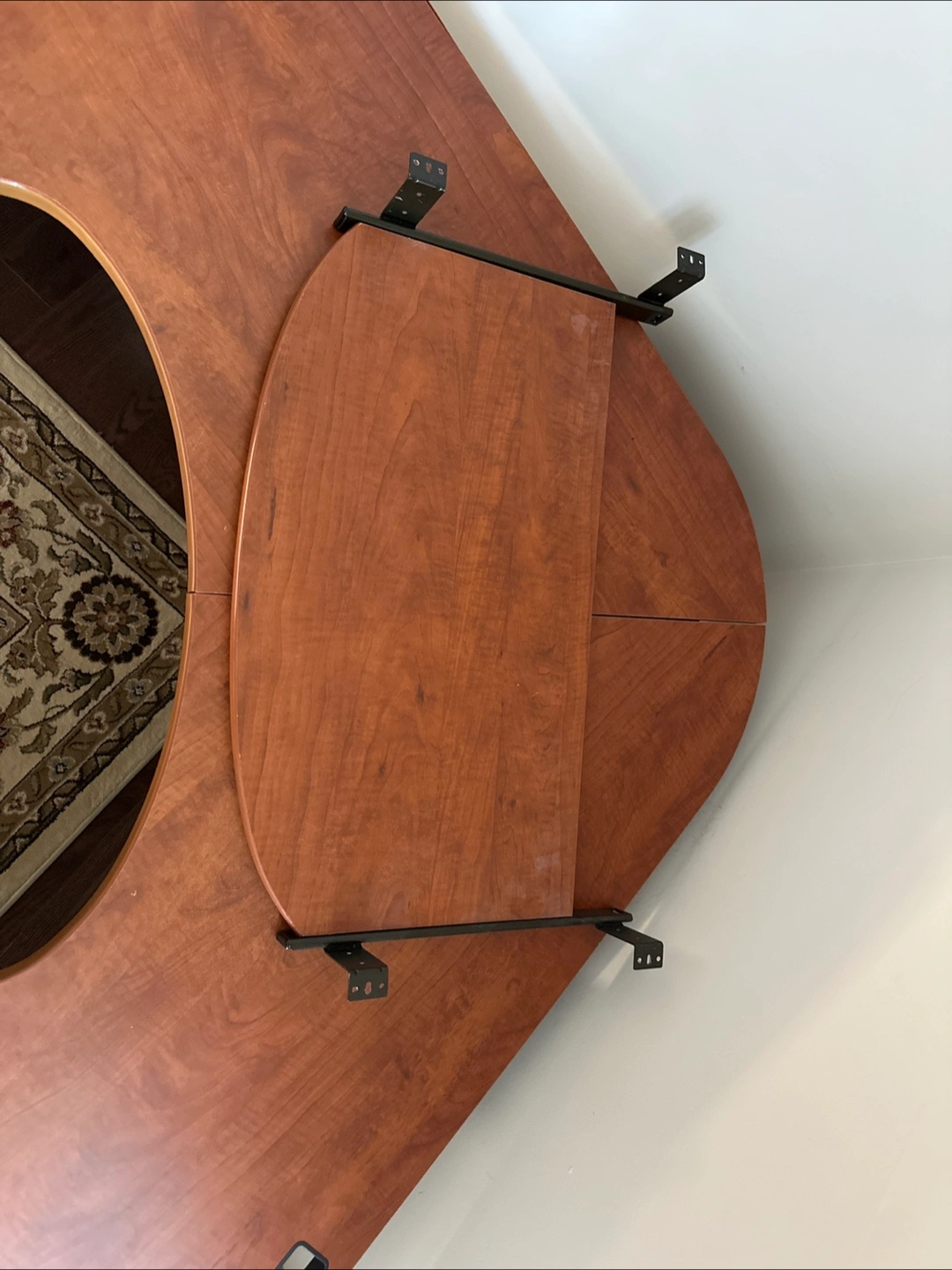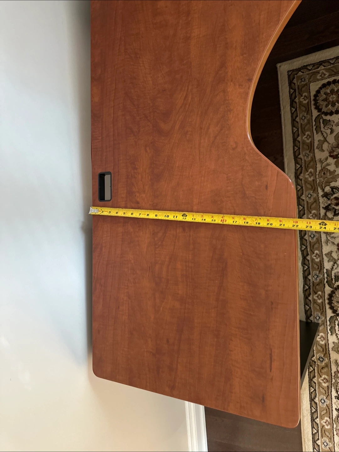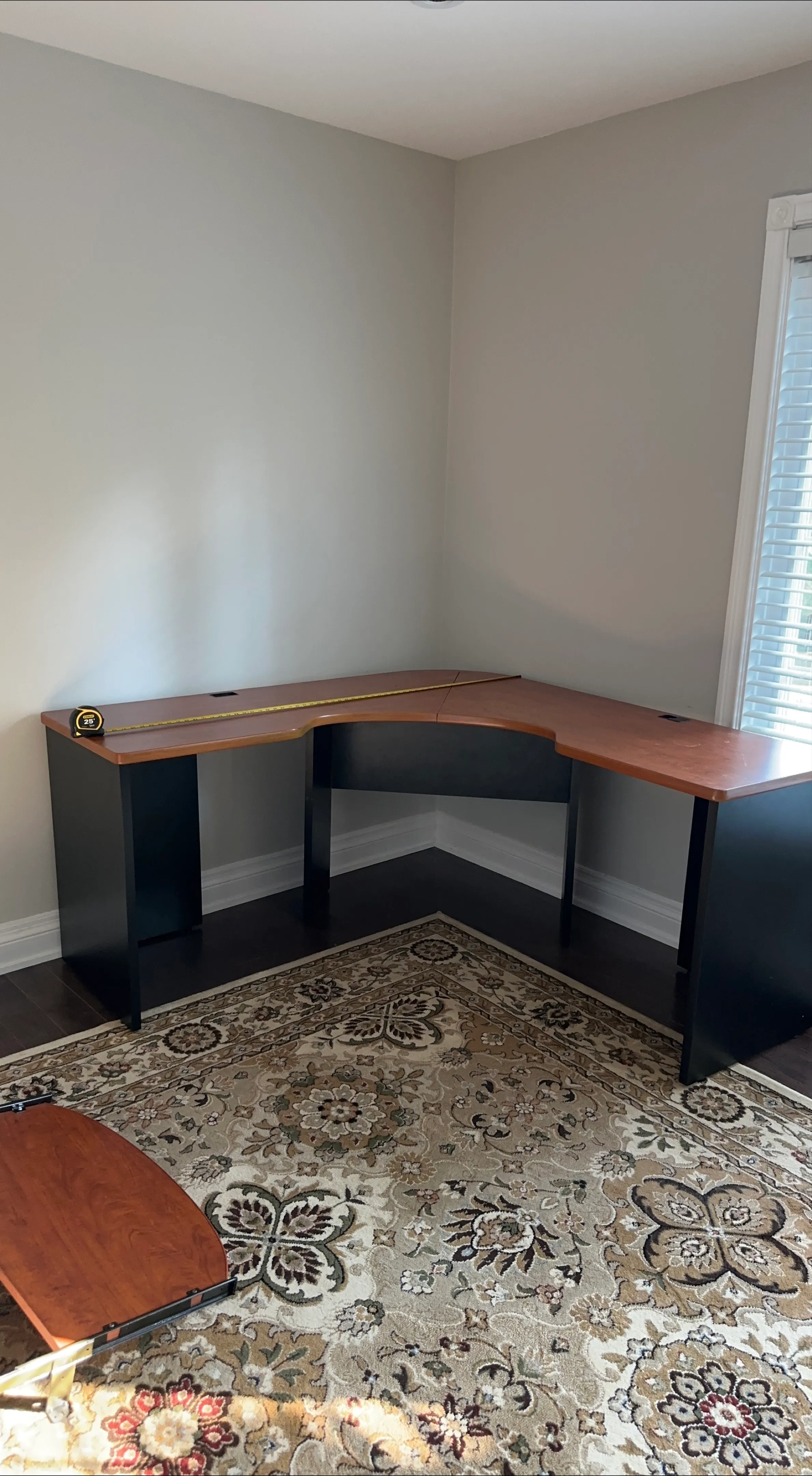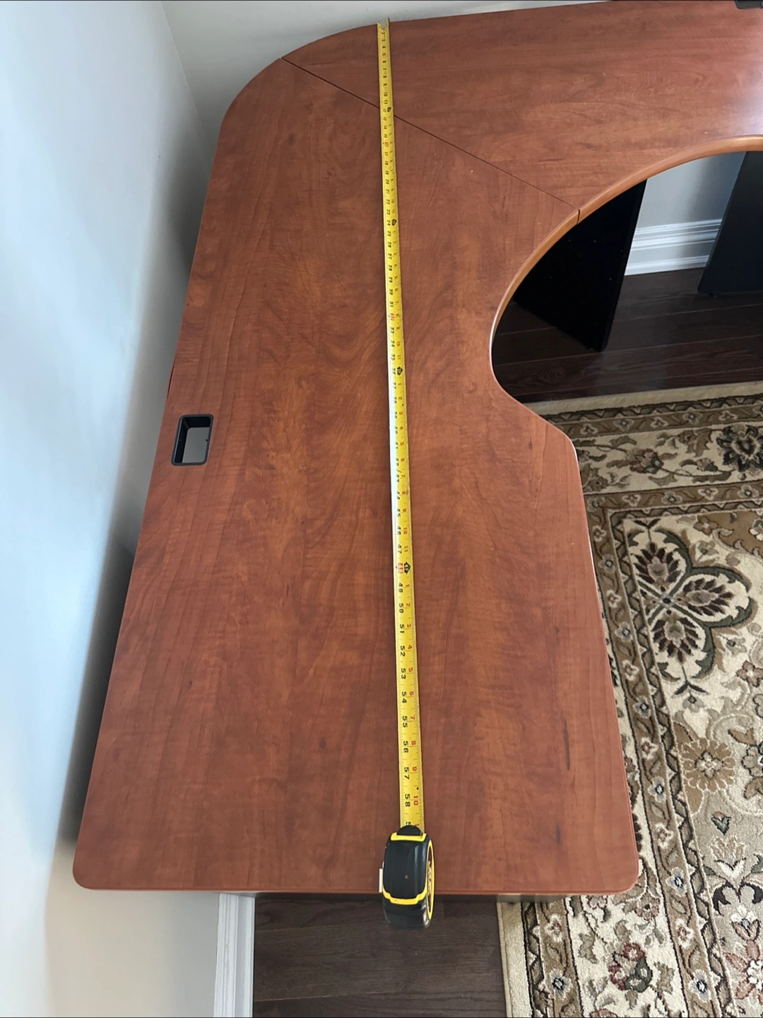 Selling a spacious L-shaped wooden desk! It's in good condition and perfect for a home office or study space. The desk features a warm wood finish and a sturdy black base.